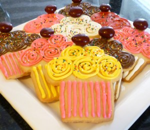 Cupcakes that are cookies … or cookies that are cupcakes… what could be better?  I made these cookies for my friend Jan.  It was her birthday and I brought these cookies as party favors for the “girls’ night out”.  Jan and I worked together for about 15 years at a cake and candy supply store.  Jan was a cake decorating teacher and as the photo shows, I was not!  In my mind, I can make straight lines and perfect swirls.  Somehow my hand doesn’t receive the message of perfection that I visualize!  So, I have decided that my designs are quirky and whimsical … and don’t drive myself crazy … or crazier … striving for perfection (although if it happens, I won’t complain).  As long as it is sweet and simple, I am a happy camper!