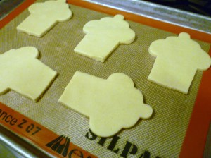 Roll the dough, on a lightly floured surface or between sheets of plastic wrap, to about 1/4″ thick (or a little thinner).  Cut into desired shapes.  Place on an ungreased cookie sheet, parchment paper or silicone baking mat.