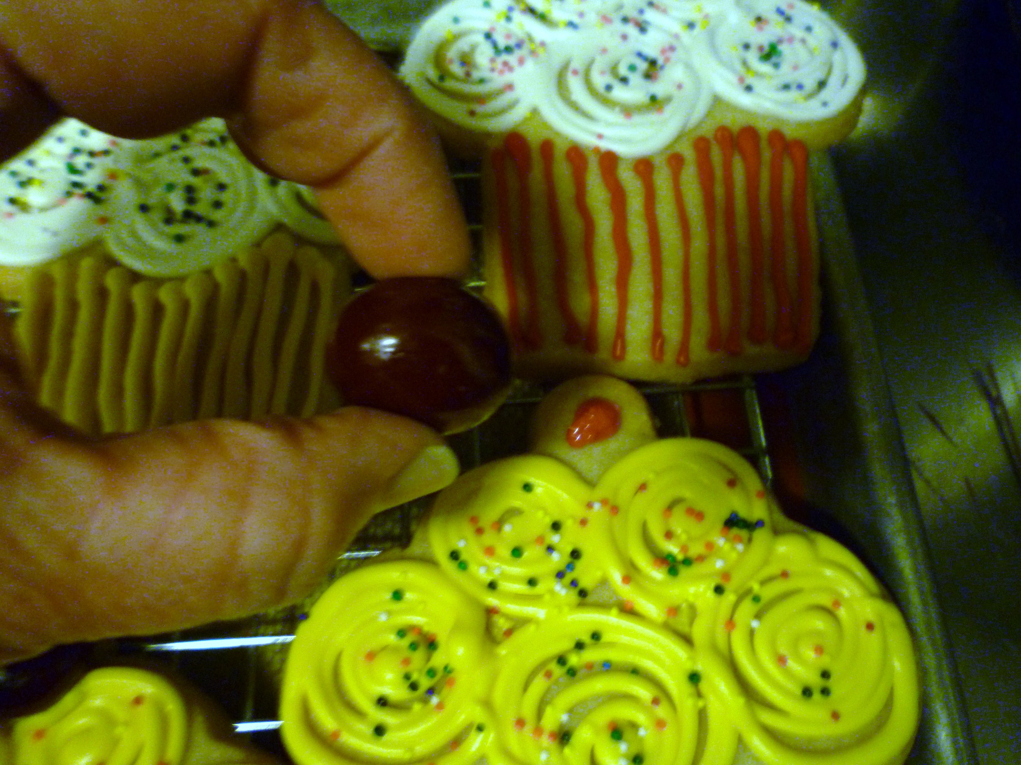 Now, the finishing touch … the cherry on top!  Attach the cherry on top of the cookie using the melted candy as the “glue”.