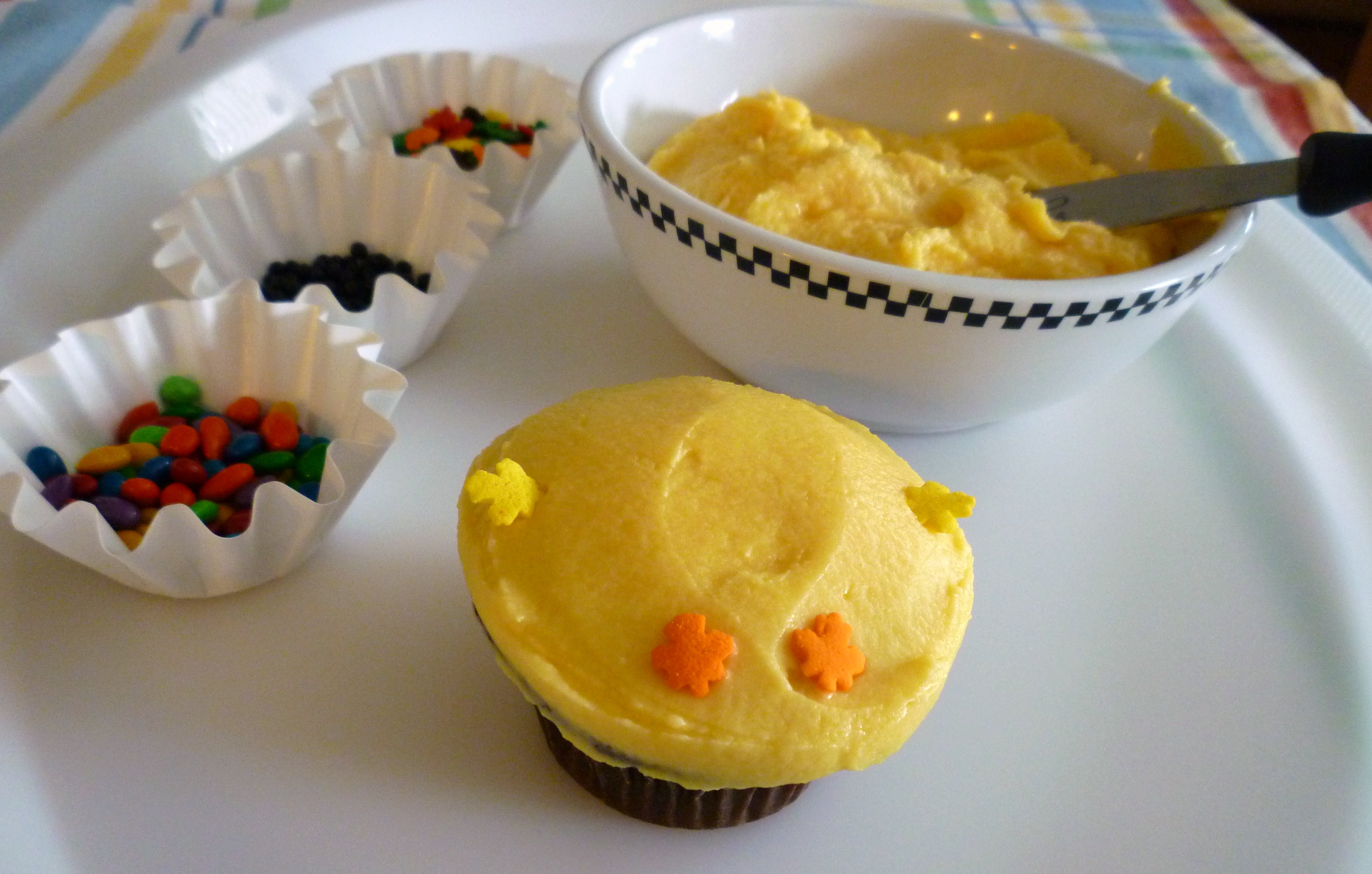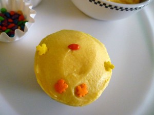Here is what you will need … cupcakes, yellow frosting, jumbo leaf sprinkles, black sugar pearls and candy coated sunflower seeds …
