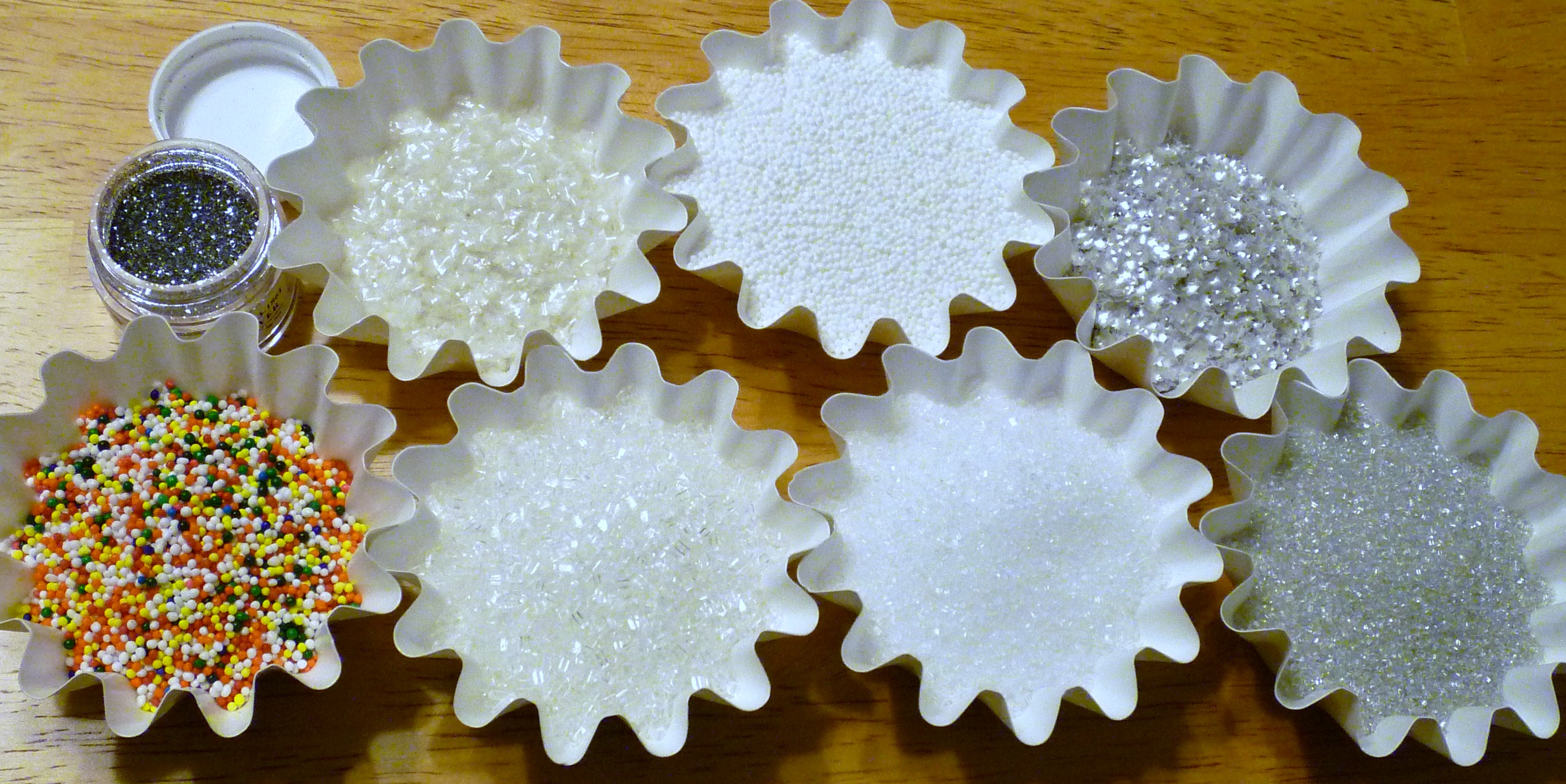 I do have quite a supply of sprinkles … just in case I need them … OK, I’ll admit I’m slightly obsessed. Here are the different ones I used …