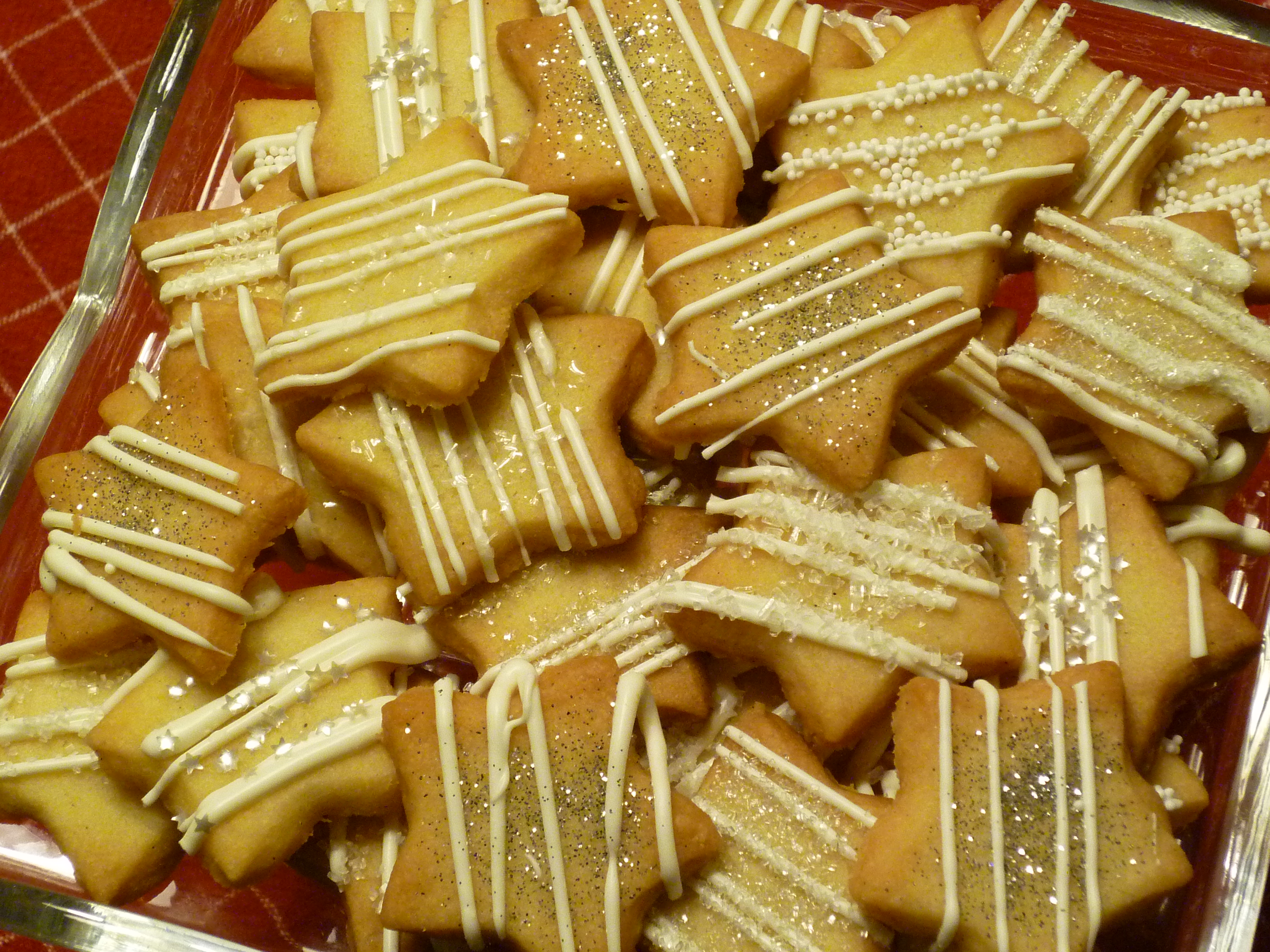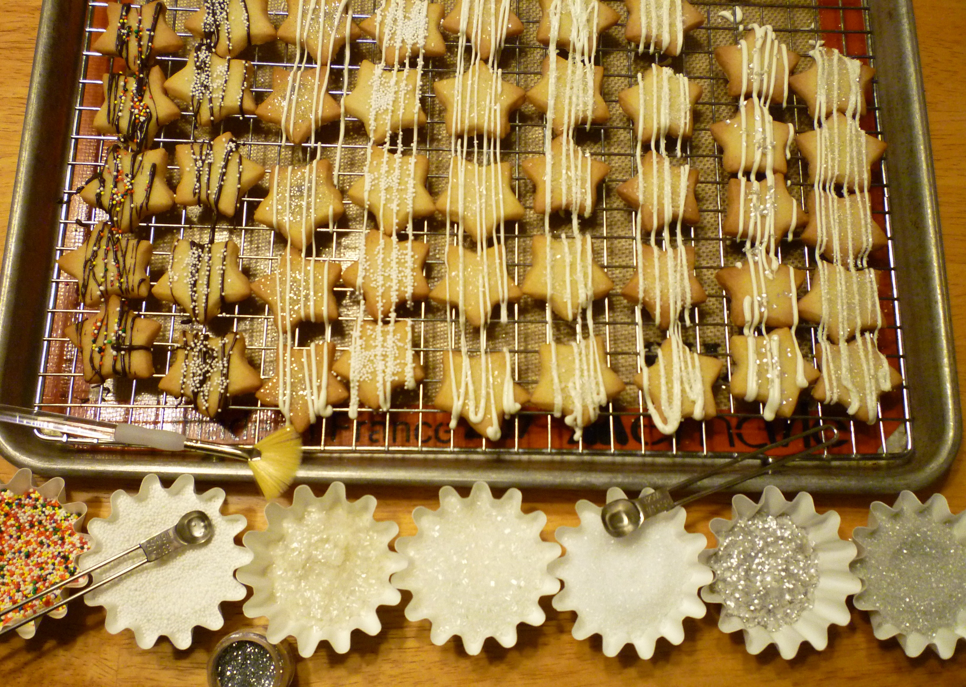 To start … I made Shortbread Cookies and melted some chocolate. I put the white in a squeeze bottle and just used a fork to drizzle the dark chocolate. A zip top bag also works well.