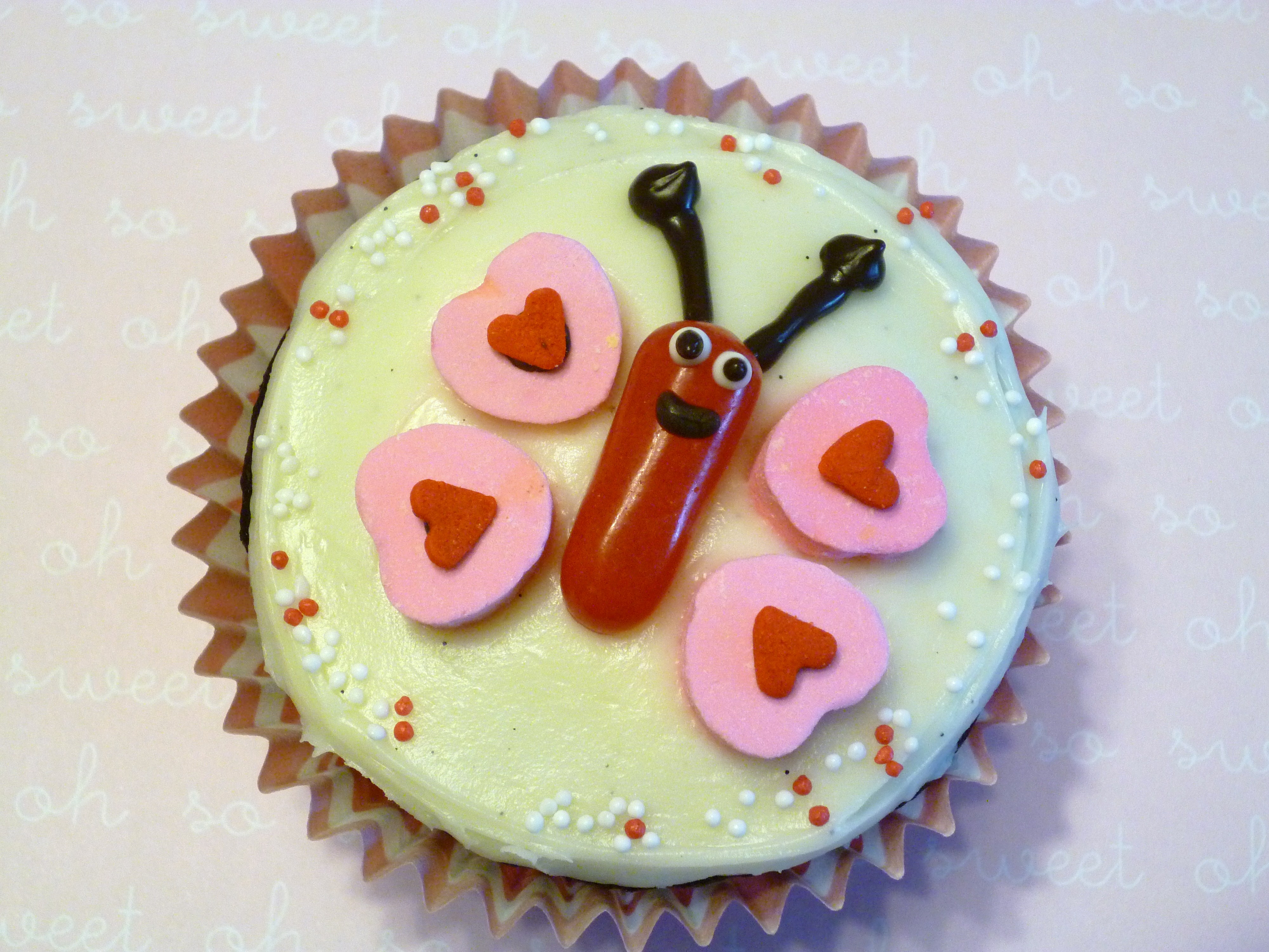 Use a Hot Tamale for the body, conversation hearts with small heart sprinkles for wings, dark and white chocolate for the face and antenna.