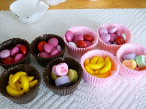 Fill your candy cups with candy. Are you wondering about the banana candy? They are like Runts candy. Remember, it’s Valentine’s Day … “I’m bananas for you”!!! Visit Sweetology … she has a very cute little tag that you can copy!