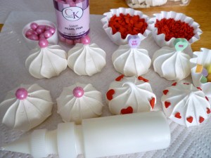 Now the cupcakes need icing … or the boxes need lids. Some of the meringues had broken tips, but that’s OK …
