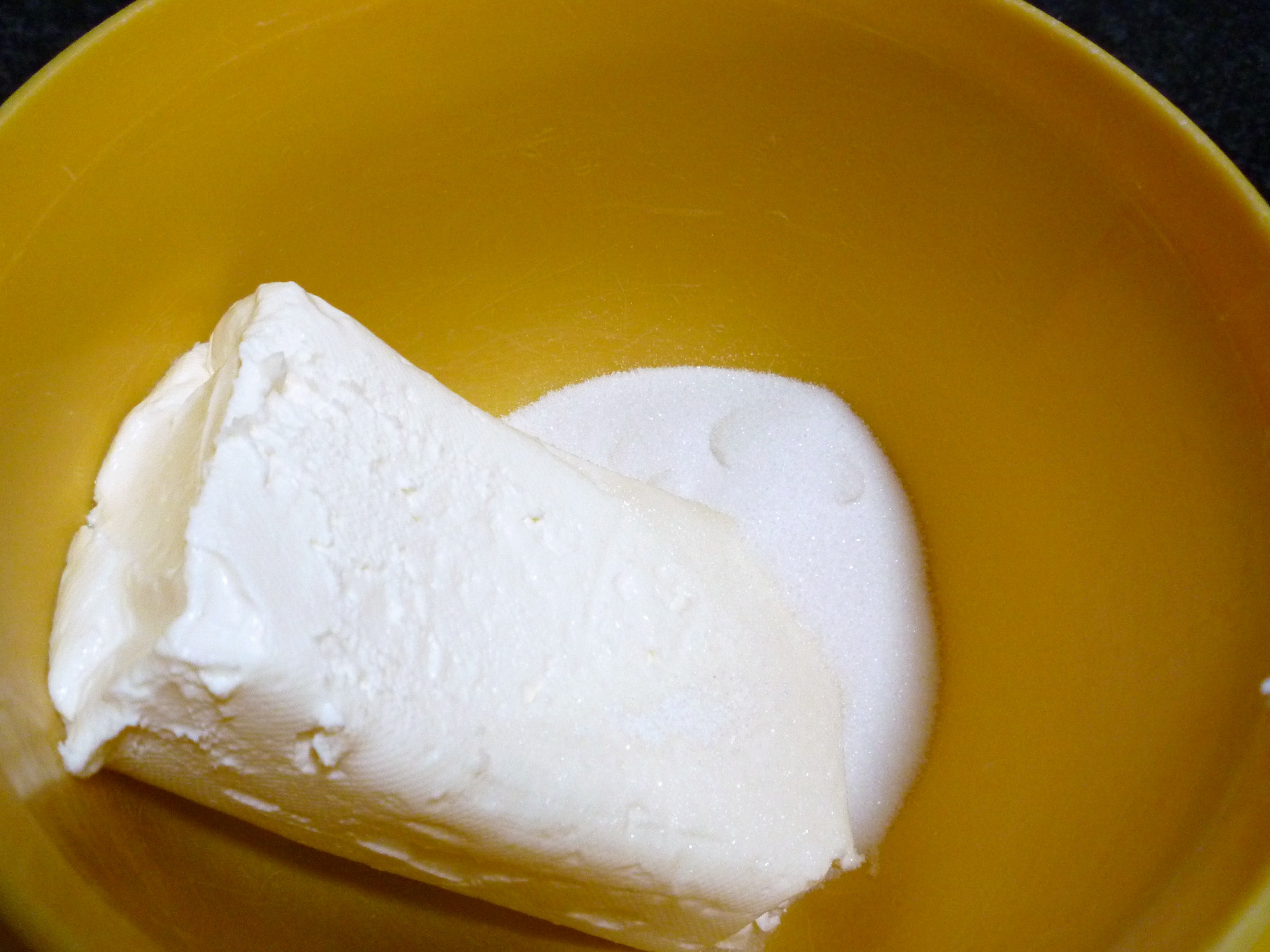 Let’s get started … make the topping first.  Put cream cheese and sugar in a small mixing bowl …