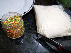 Let the batter rest while you heat up the waffle iron.  Take the cream cheese topping out of the fridge and cut off a small corner of the bag … look, an instant pastry bag …