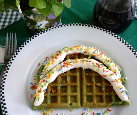 Green waffle batter + a little cocoa + cream cheese topping = green velvet waffles!  Consider the warm maple syrup “the gold” at the end of this rainbow.  This breakfast is a special little treat for St. Patrick’s Day.
