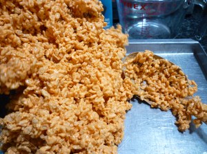 1. Grease a 12″ x 15″ x 1″ pan and set aside.  Also grease a spatula or wax paper to use for pressing finished cereal mixture in pan.