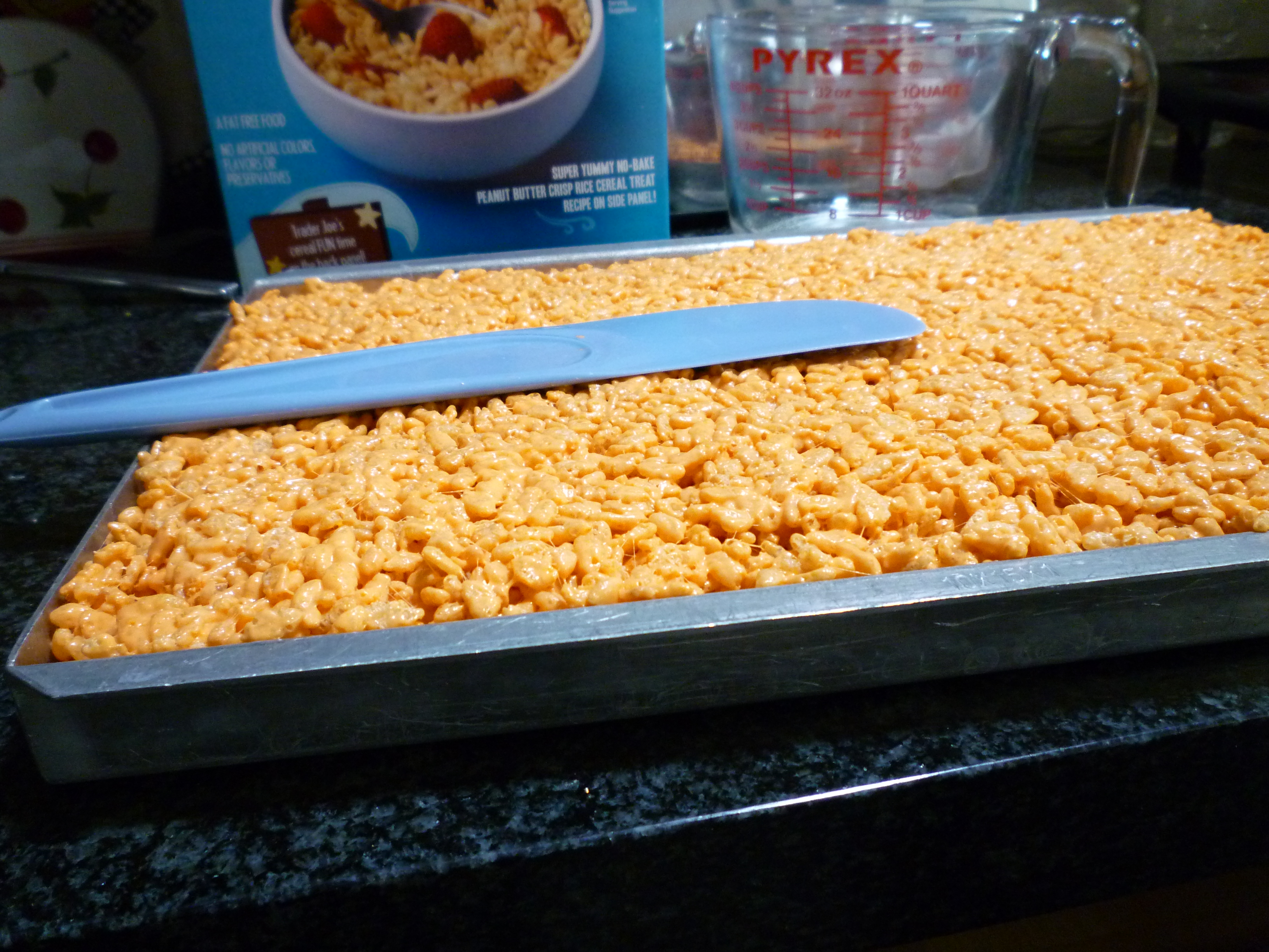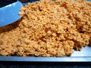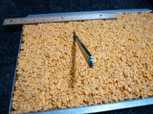 5. Pour mixture into prepared pan and press (using prepared spatula) into an even layer.  Let cool (about 1 hour), cut into servings.  About 25 servings – 3″ x 2″.