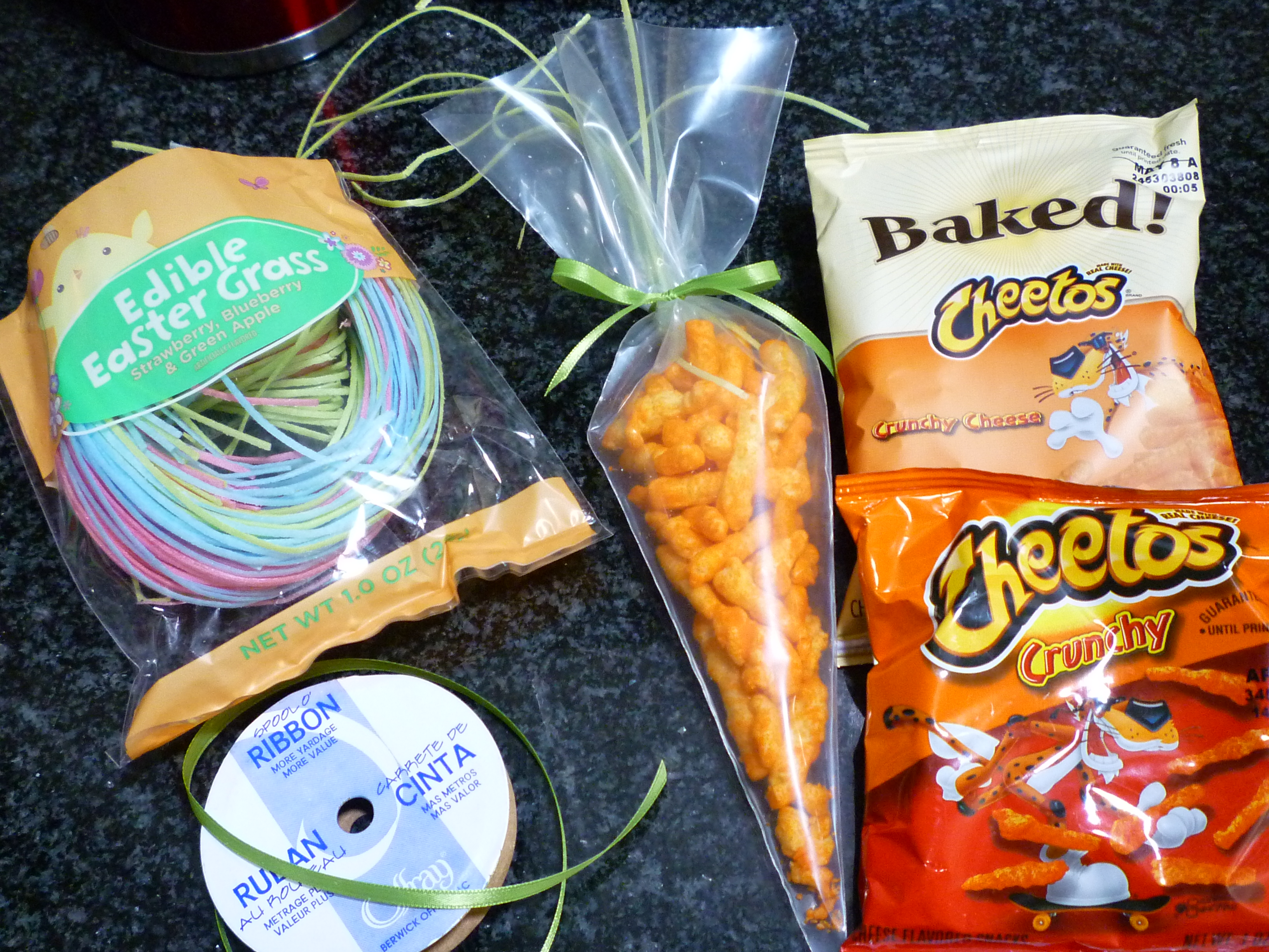 • I’m sure that you have seen candy carrots in disposable pastry bags … here is a non-candy variation.  I used about 1 ounce of Cheetos (1 individual bag) in each pastry bag …