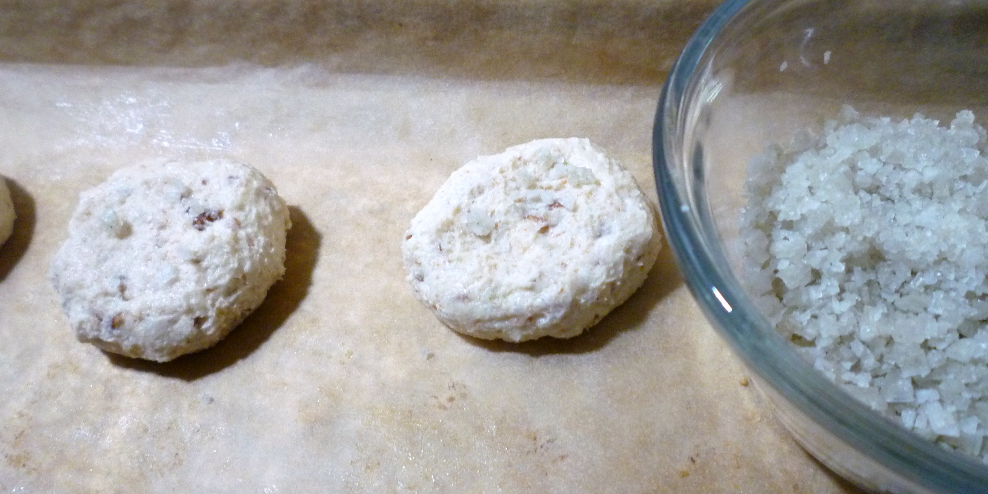 6. Remove dough from the fridge.  Roll dough into 1″ balls and flatten slightly.  Place dough on parchment lined or ungreased baking sheet.