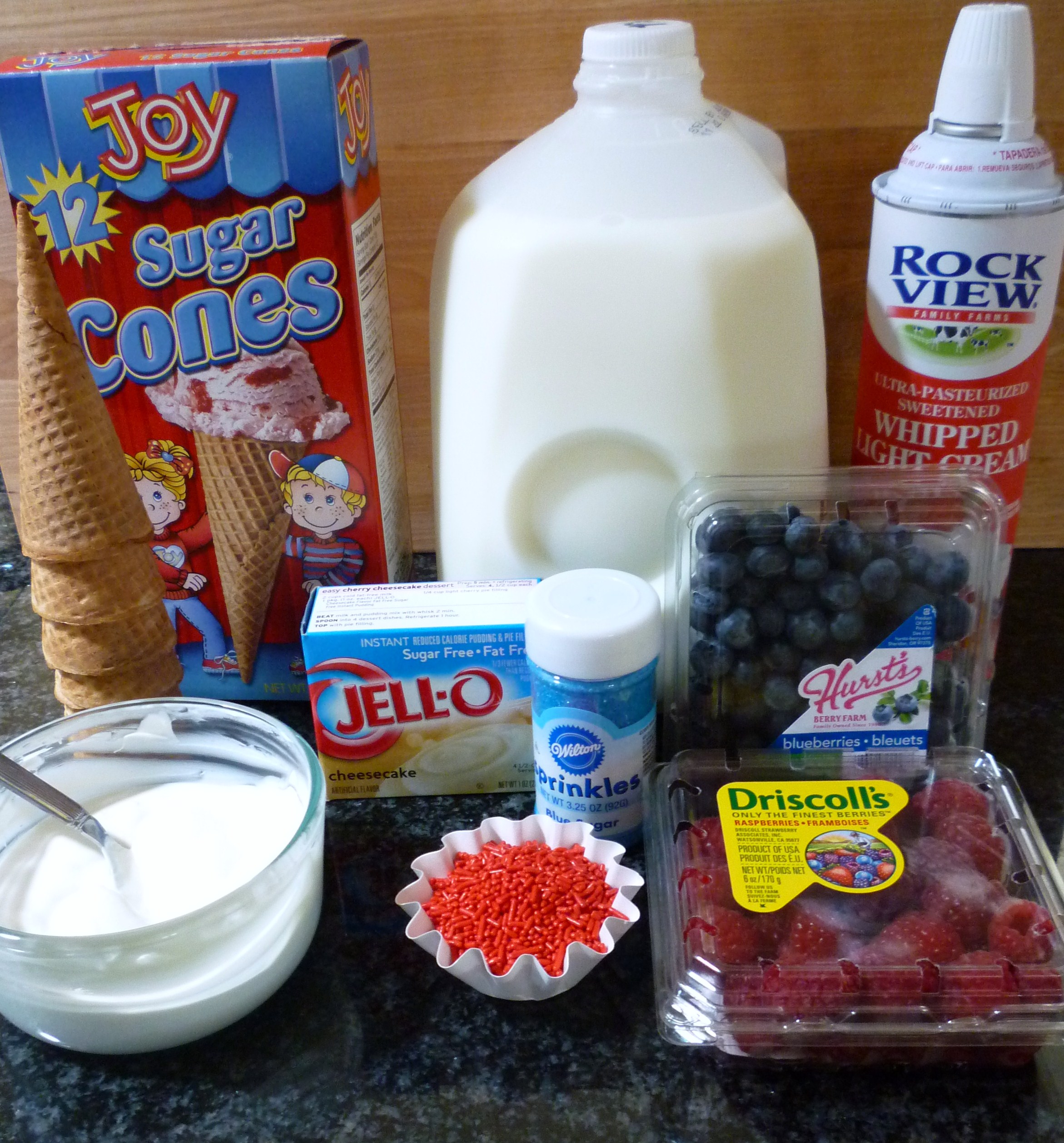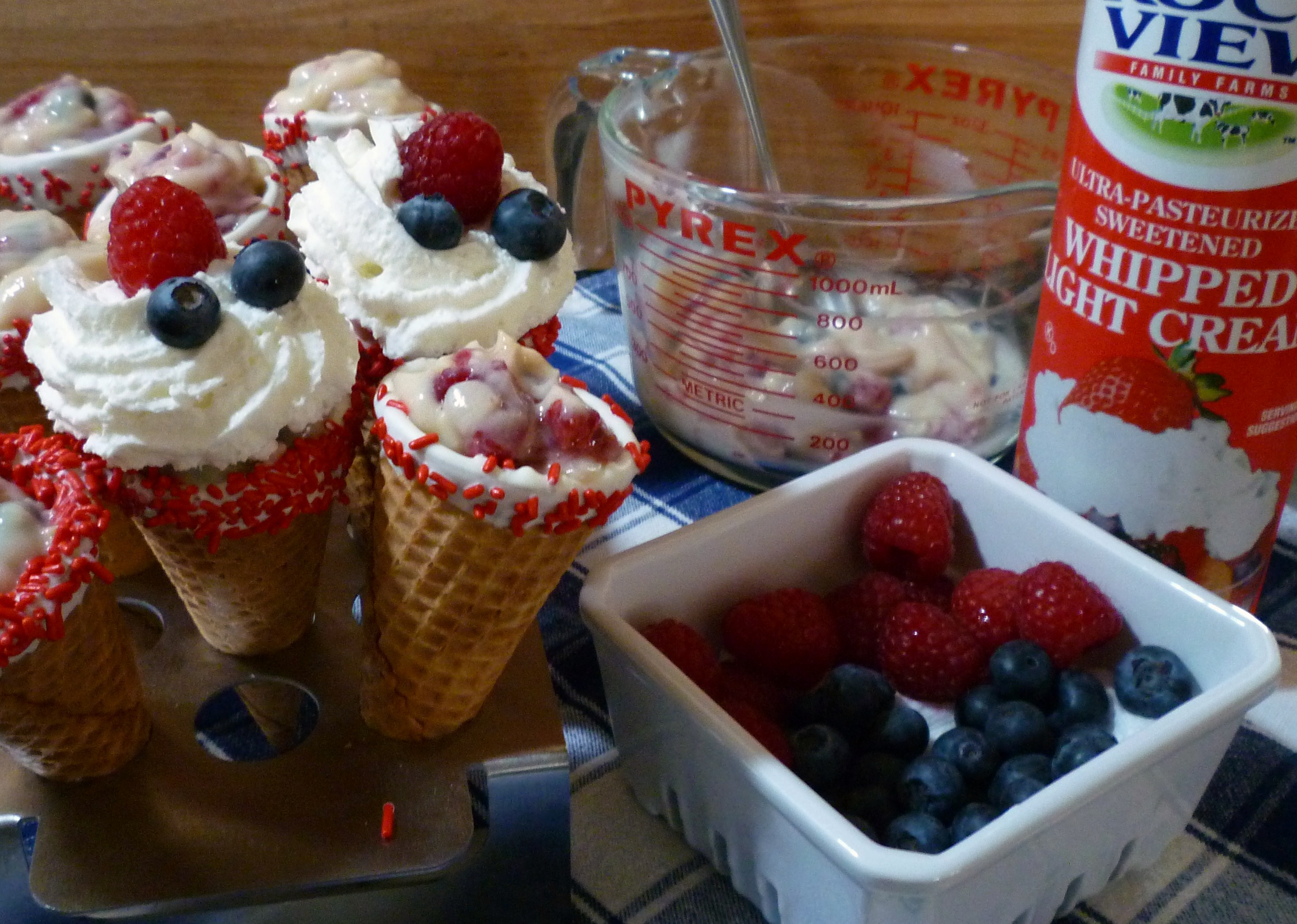 I went to the grocery store yesterday … so many berries are in season right now and on sale … buy one, get one free!  Red, white & blueberry cones were about to be created.