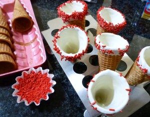 The cones can be made several days in advance and stored in an air tight container … it’s a real timesaver.  To make the cones … spoon melted chocolate in the cone … rotate it, to coat the entire inside … pour out the chocolate and tap the cone to remove excess chocolate … add sprinkles to the outside edge … set aside to let the chocolate harden up …