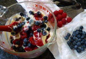 Make the pudding (using 1 – 3/4 cups) following the directions on the package.  Fold in the berries … remember to reserve some for garnishing …