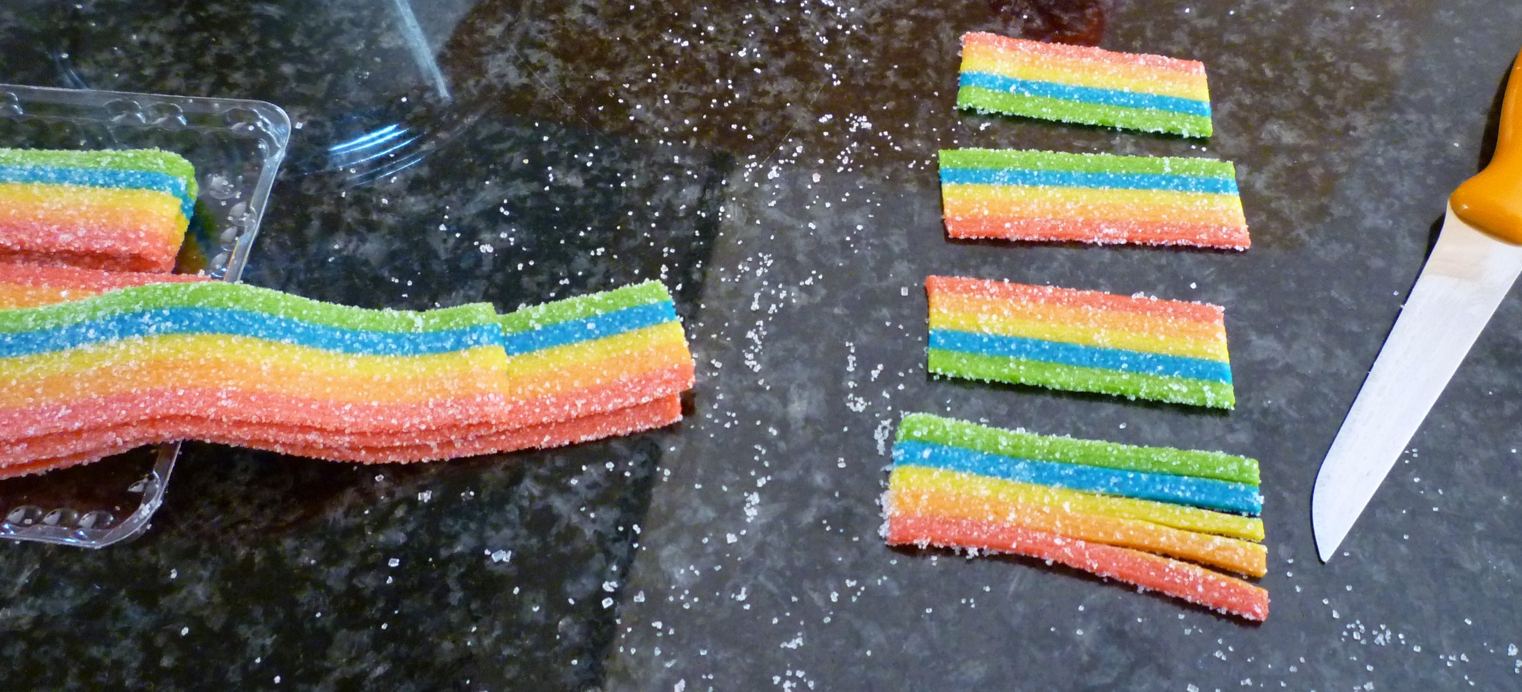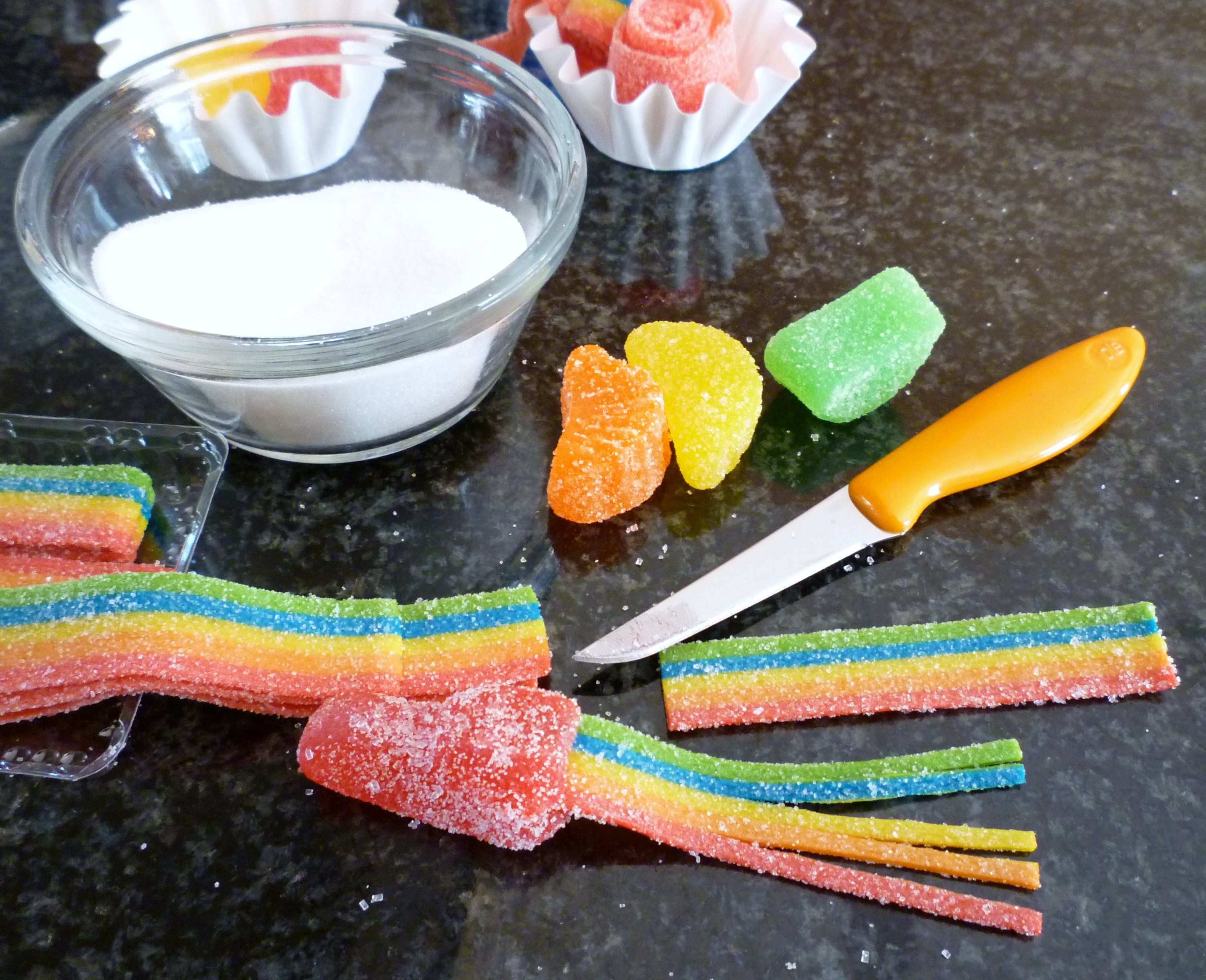 Make the noise makers/blowers … use a paring knife to cut the Extreme strips in half, then cut strips to create “fringe” at the end of each piece. Shape the fruit slice candy to look like a mouthpiece. As the candy gets gummy, dip it in the granulated sugar. Use a knife to make a cut and insert candy tape.
