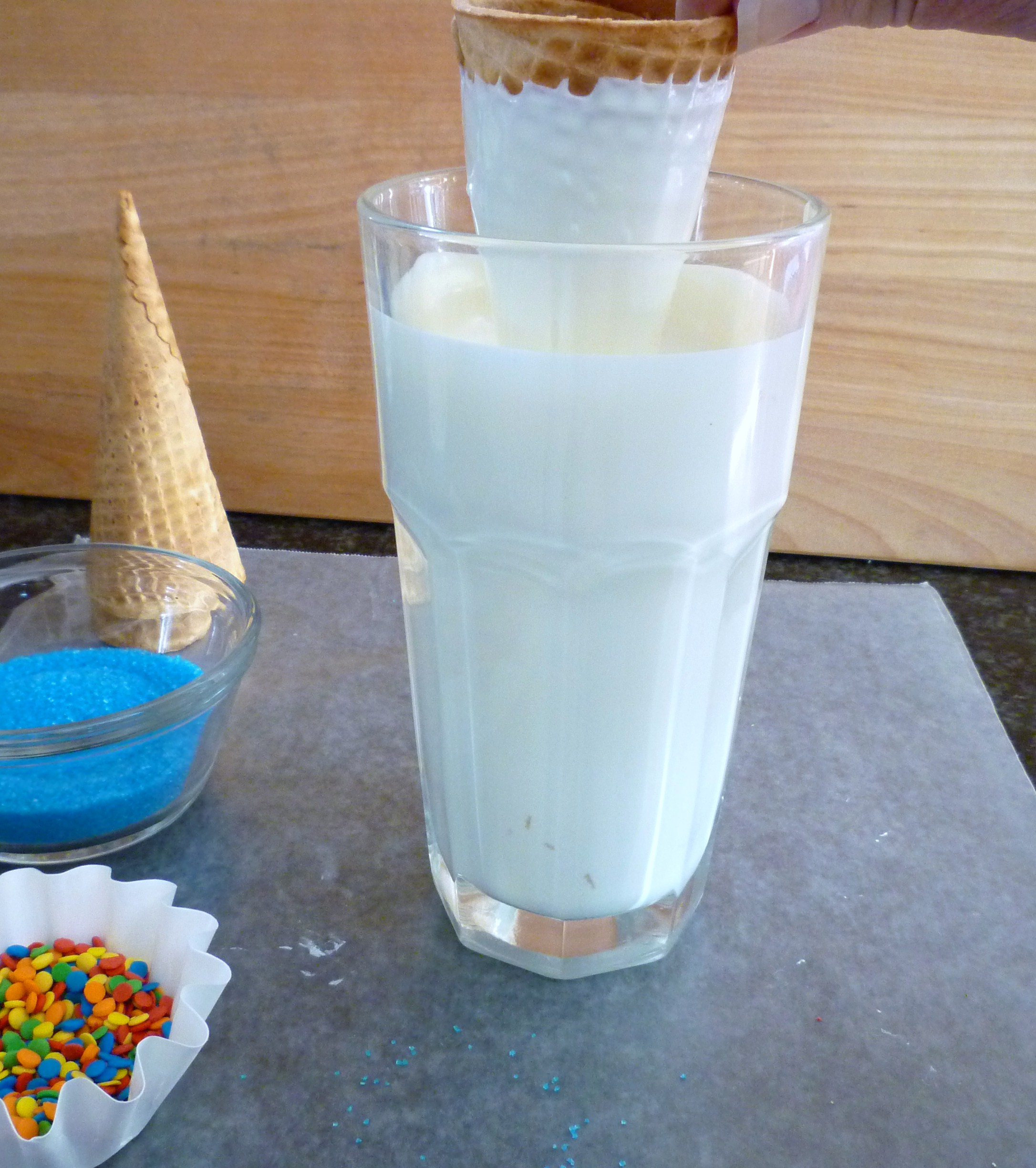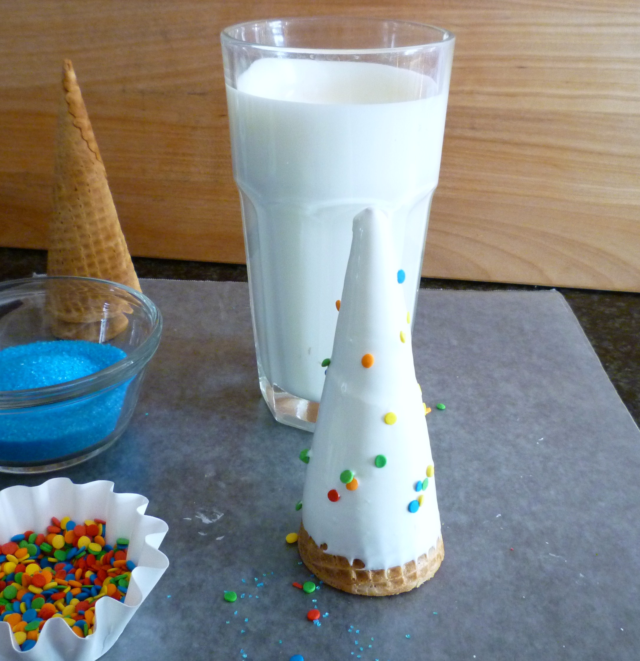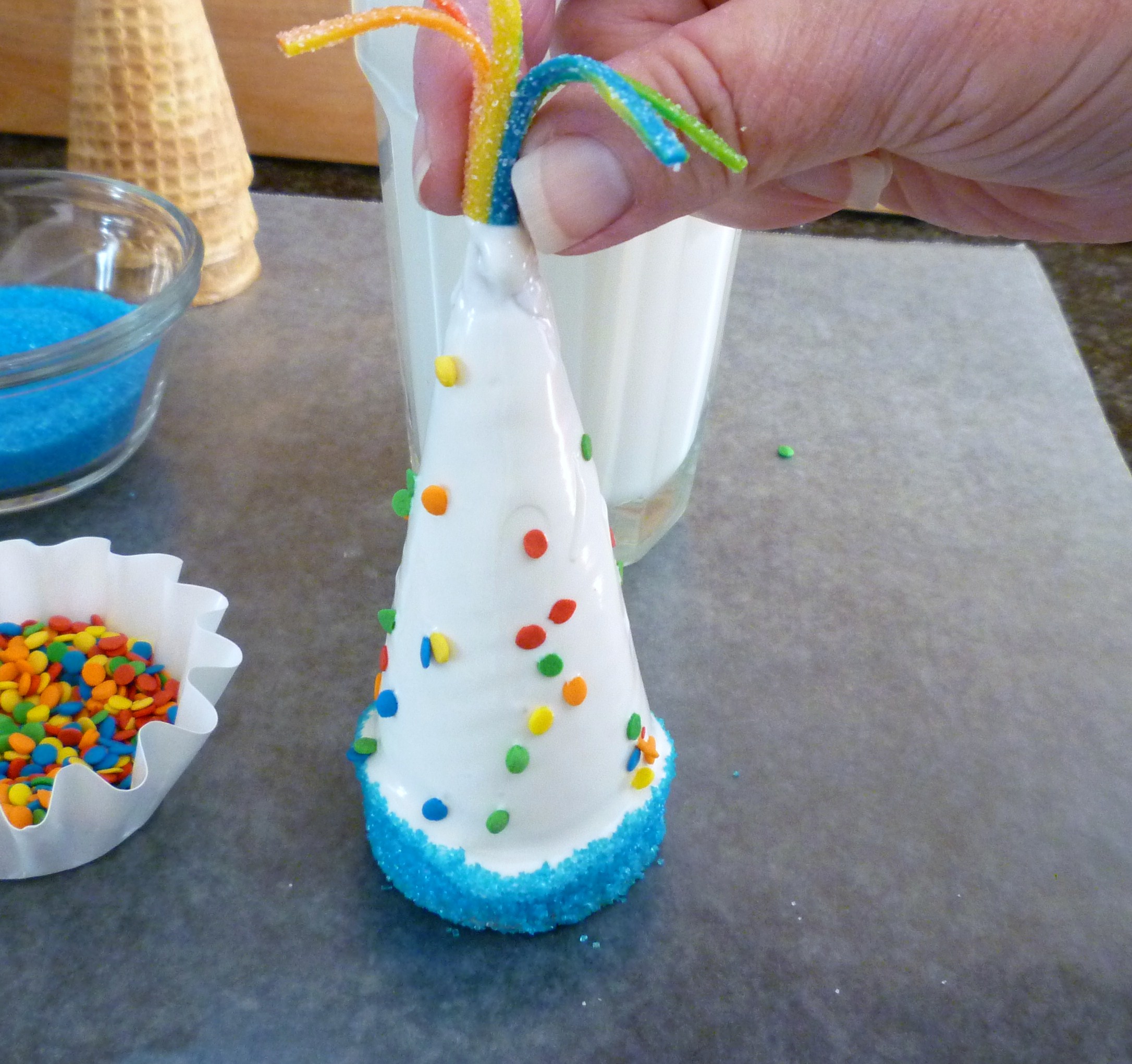 Make the party hats … place the melted white chocolate in a tall container, dip cone and shake off excess chocolate …