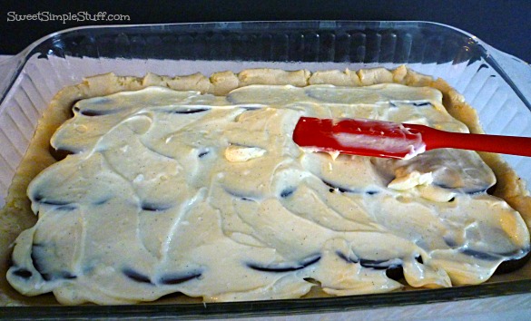 1. Heat oven to 350°F.  Press dough evenly in a greased 9″ x 13″ baking pan.