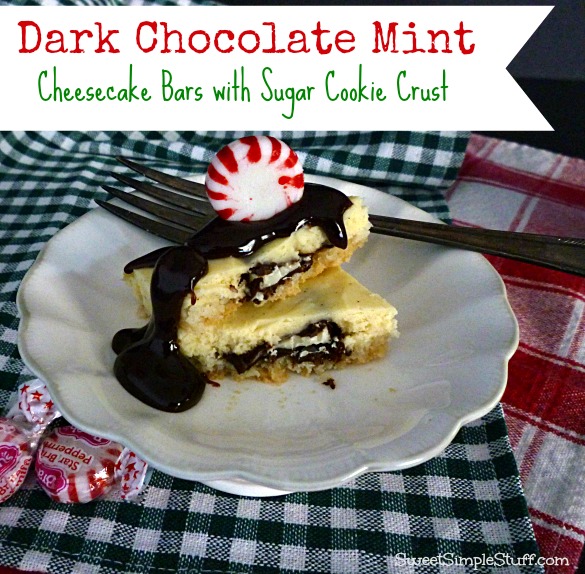 Today’s version is made the same as yesterday’s, Chocolate Pumpkin Spice Bars … just used the Dark Chocolate Mint Ovation Break a Part.  I always make something mint flavored for Christmas, but these would be a great choice any time of year.  Cheesecake, dark chocolate, mint, sugar cookies and topped with hot fudge … it can’t get any better than that!