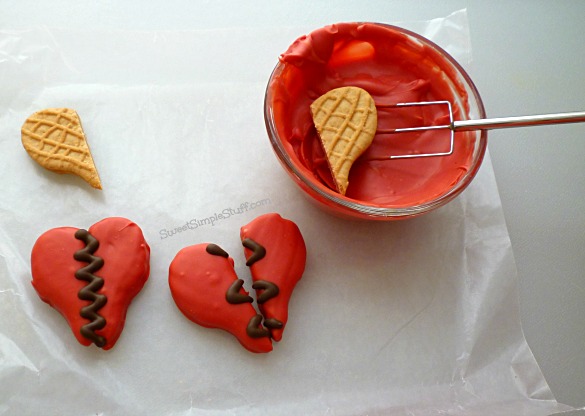 I wish Nutter Butter cookies were made in a variety of shapes … since they aren’t … I felt the need to make my own heart shape for Valentine’s Day. OK, it’s time to cue the music and start singing … How Can You Mend A Broken Heart by the Bee Gees … or just hum along. I do have the answer to the question … you can mend a broken heart with chocolate … at least a broken Nutter Butter Heart 😉