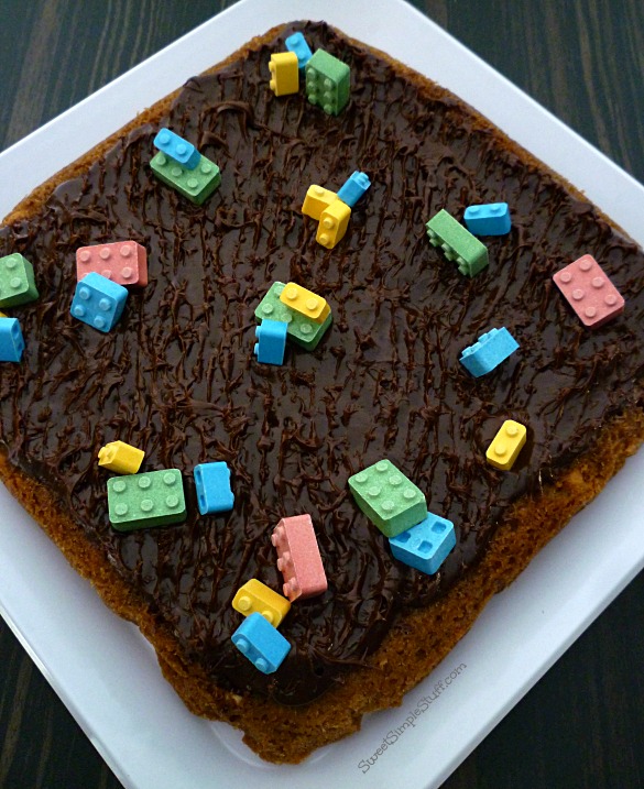 7. Place frosting in microwave for 10-20 seconds, stir well.  Spread the warm frosting over cookies, use a fork to create carpet looking texture, sprinkle with Lego candy, cut and serve!  Makes 16 – 2″ squares.