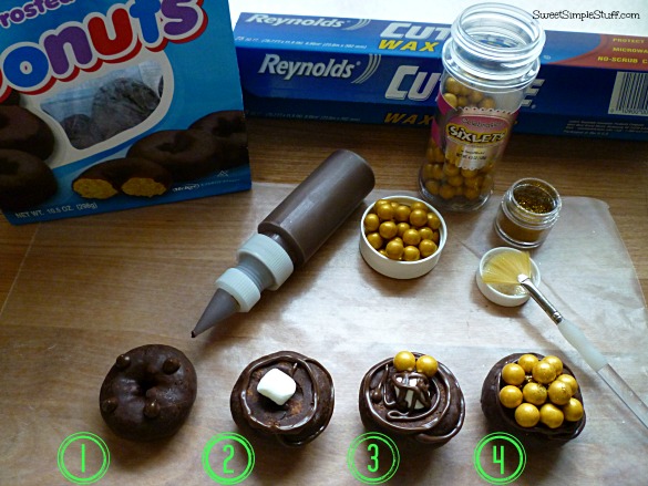 - Melt chocolate according to package directions and place in a squeeze bottle or pastry bag. Make 4 chocolate dots (legs) on top of donut.