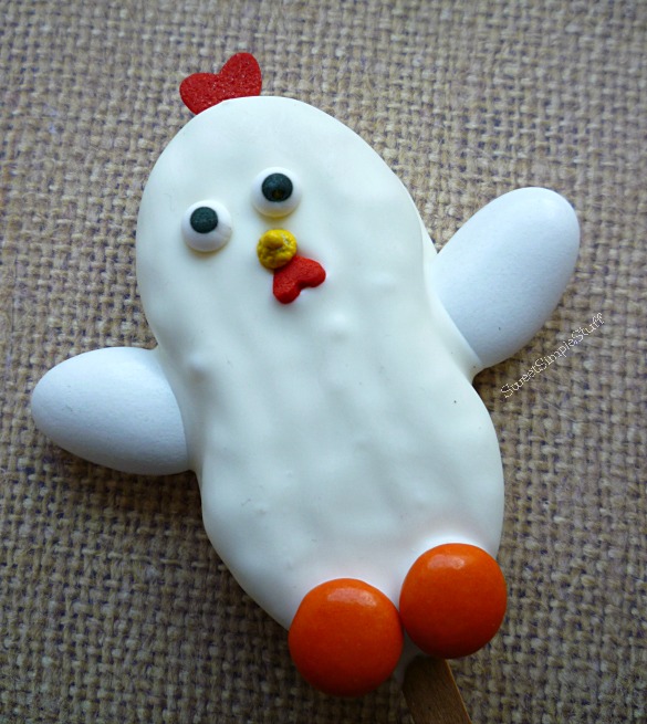 Good morning! I am typing this post from a hotel room … the hubby and I are on “spring break”. We are not college kids, but the parents of a college kid left at home to go to work and school while we have fun! I like this version of a spring break and highly recommend it 😉 These little pops were made the night before we skipped town. It has been a year since I made Nutter Butter Chicks … they grew up … into Nutter Butter Chickens!