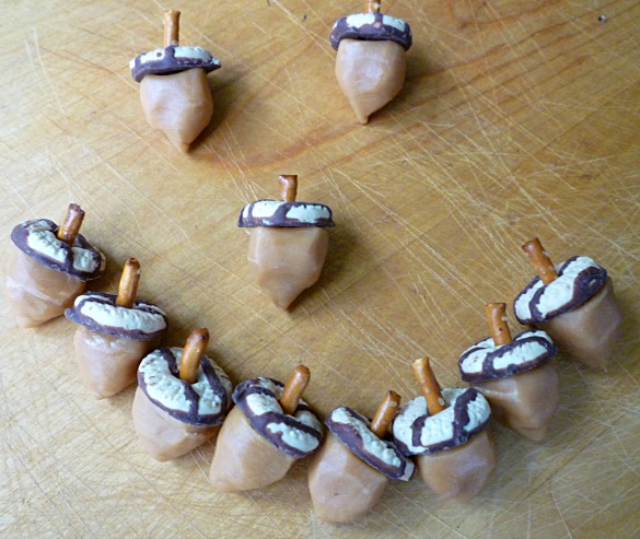 - Break pretzel sticks in half (one half will be used for each acorn)
