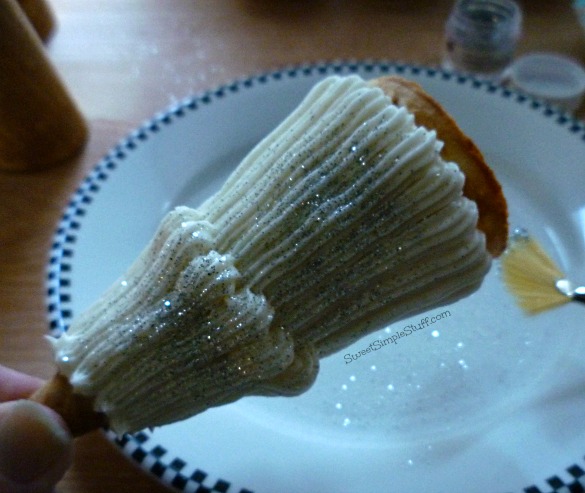 Sprinkle silver dust on the frosting over a plate (so you can reuse dust that misses the tree). If you have a fan brush (or any brush), dip the tip in the dust and tap on the brush to release the dust …