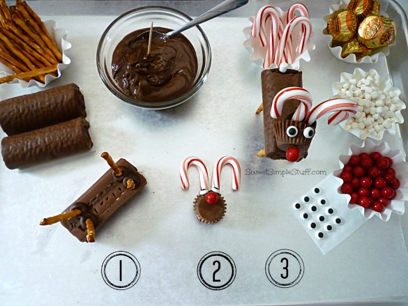 - Work on a tray lined with wax paper or parchment. Give the reindeer four legs – turn a Swiss Roll bottom side up, dip the end of pretzel sticks in melted candy and insert into Swiss roll about 1/2″ to 3/4″ Make sure that all four pretzels are equal in length after they are inserted in the Swiss Rolls to ensure that the reindeer will stand up.