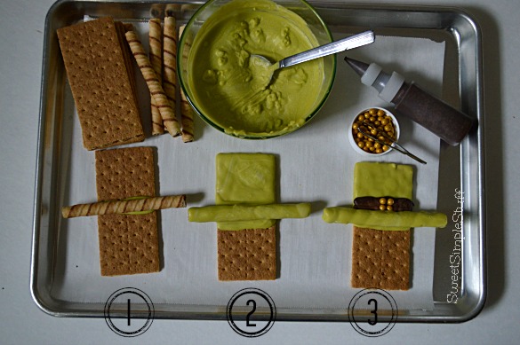 1. Melt candy according to package directions and use a small amount of green to attach a tube cookie at the middle line of a graham cracker, let candy firm up.