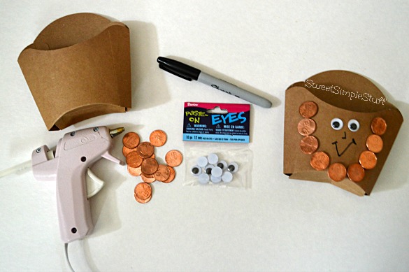 Use small dots of hot glue (one at a time) on the french fry box to attach 9 pennies, forming a beard.  Use hot glue to attach 2 eyeballs and Sharpie to draw a nose and mouth!