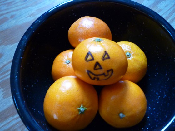 Aren’t these the cutest little jack-o-lanterns? Well, they are really tangerines and a face drawn with a Sharpie marker … which is non-toxic. My friend, Gwen, made them … she is so clever!