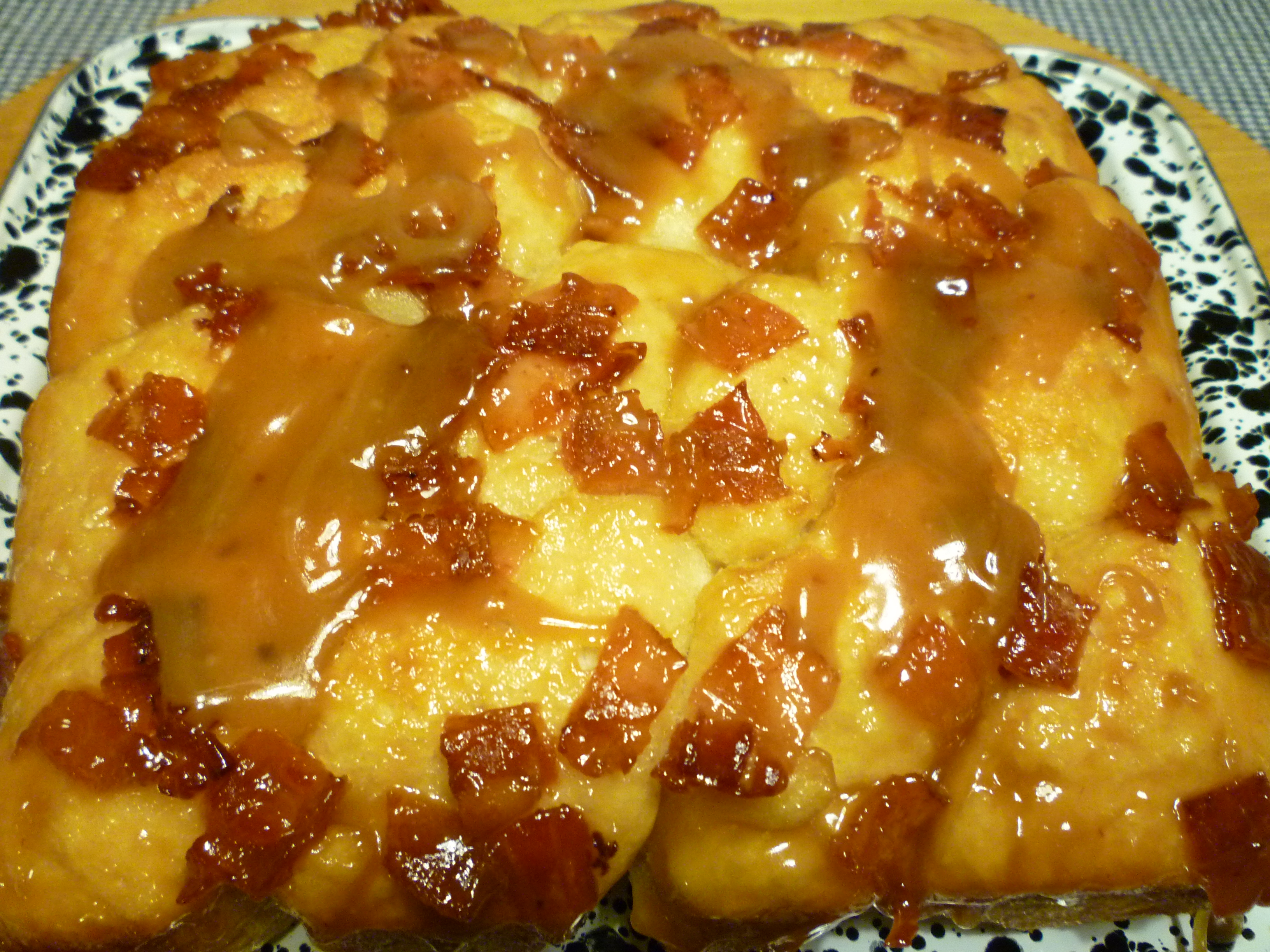Let me apologize now for the lack of photos … I got sidetracked … it happens often … I wanted to make sure that nothing got burnt, this time. But, all of us thought that this was so yummy … it needed to be shared. I would describe it as a maple caramel bacon biscuit … wonderful and evil at the same time 🙂