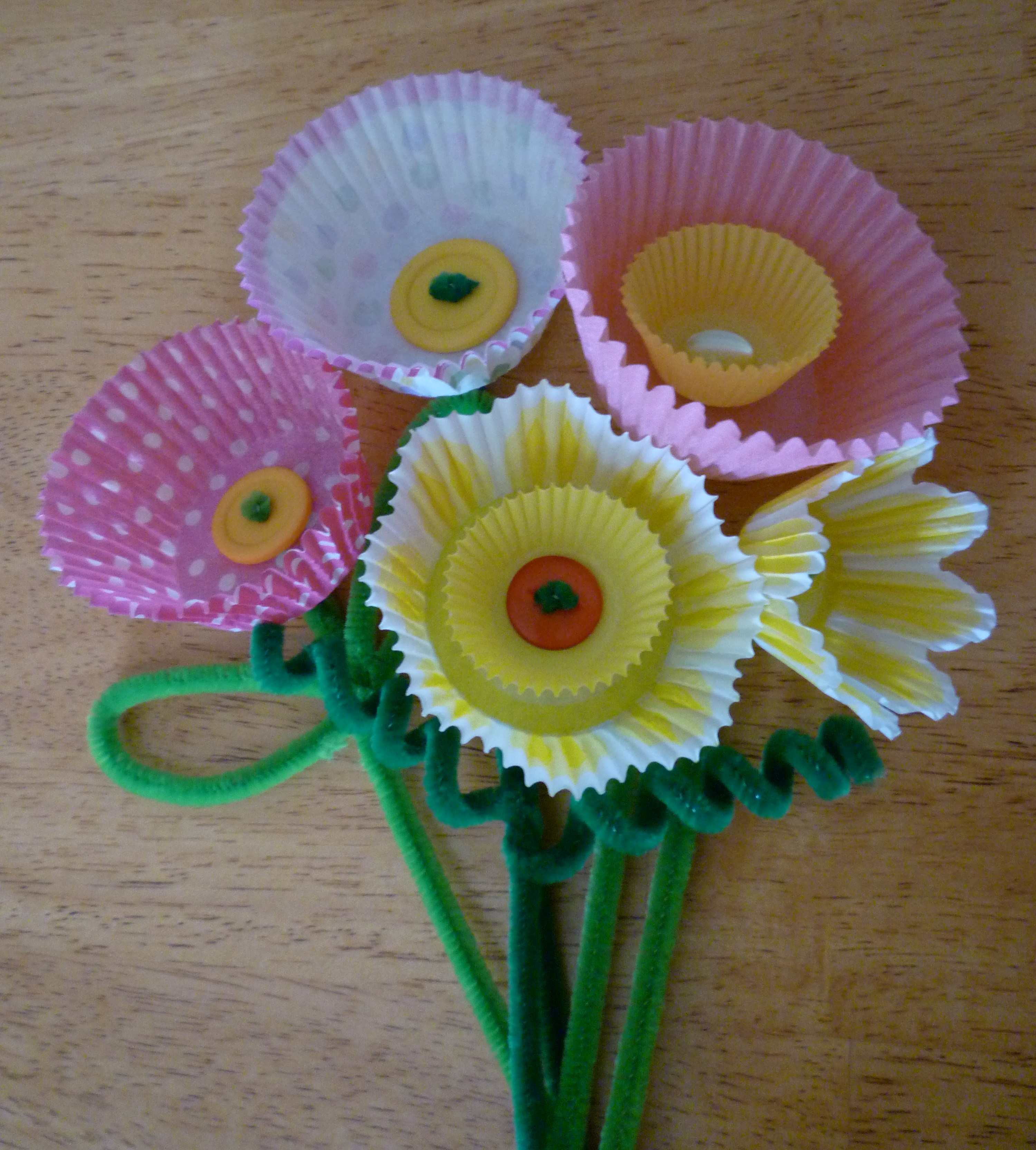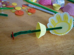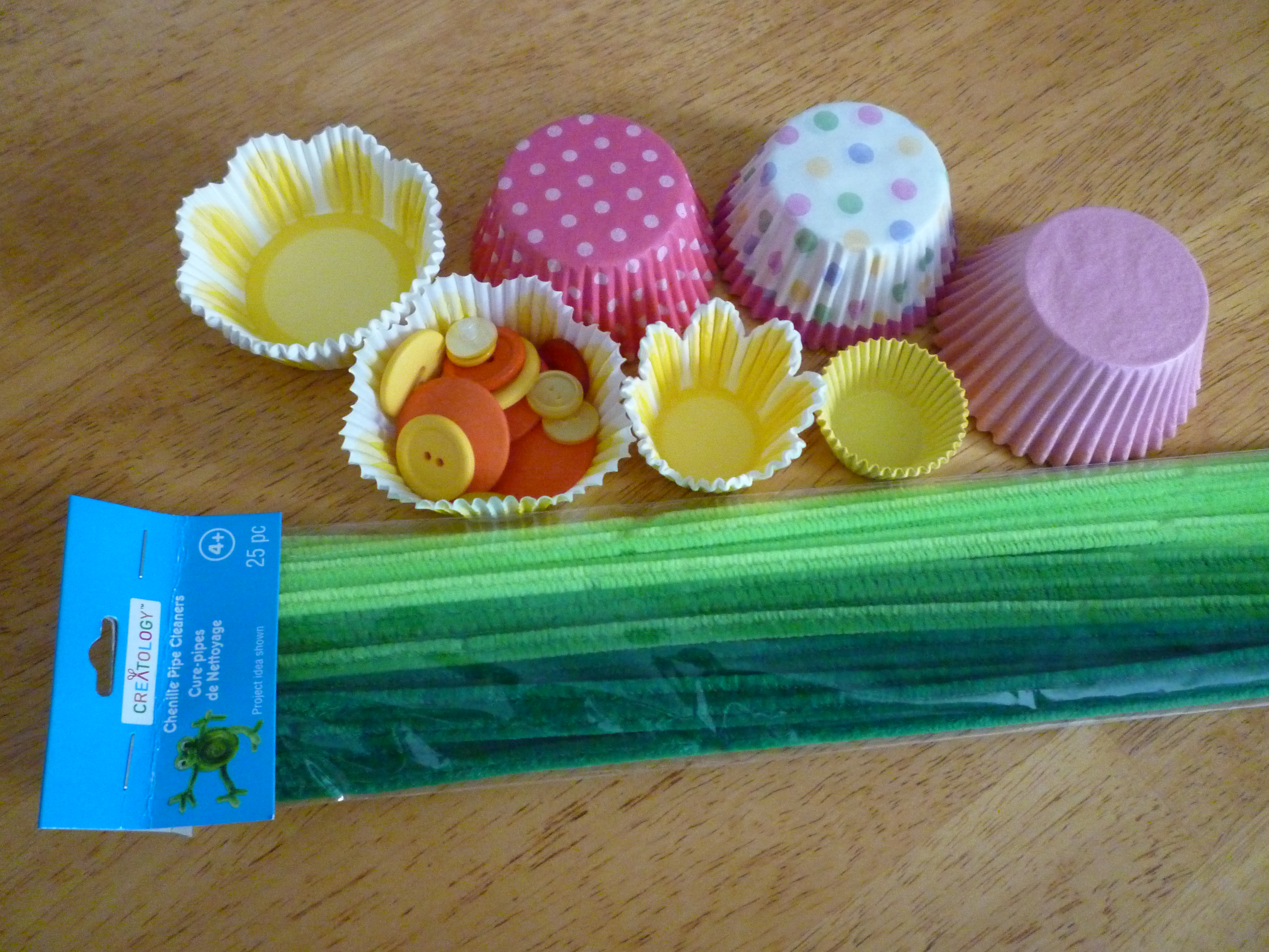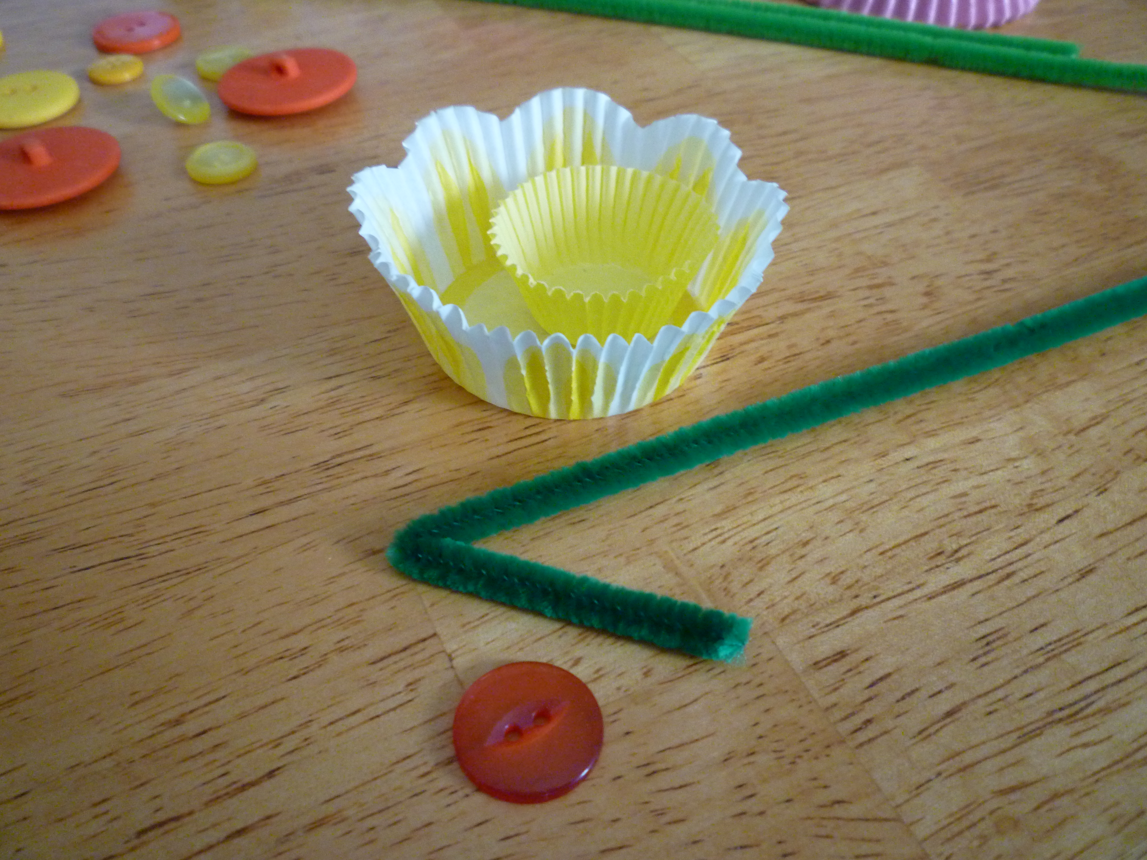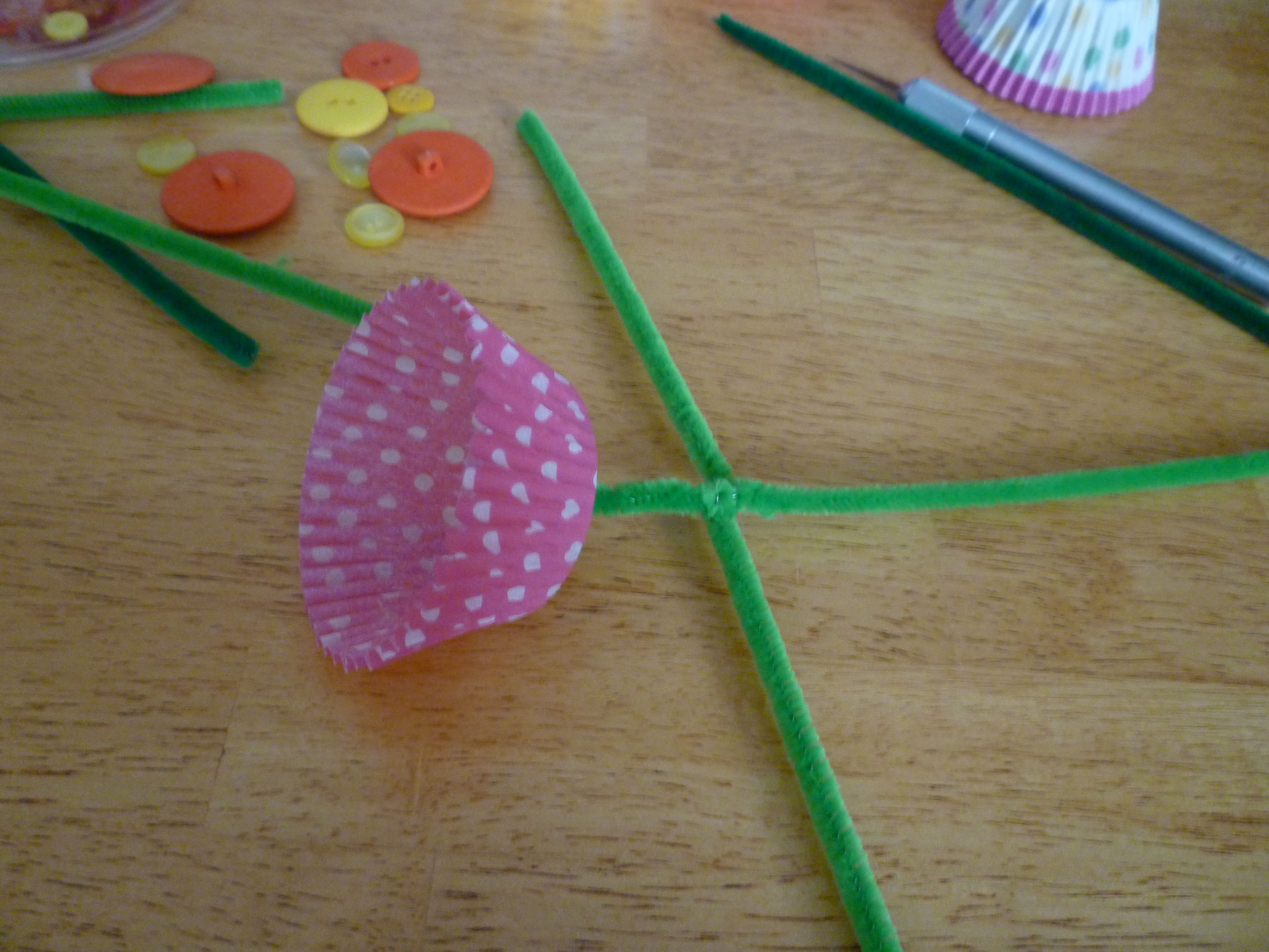 These are the supplies you will need to make the flowers … cupcake liners, buttons, pipe cleaners and something to poke a hole in the cupcake papers (I used an exacto knife) …