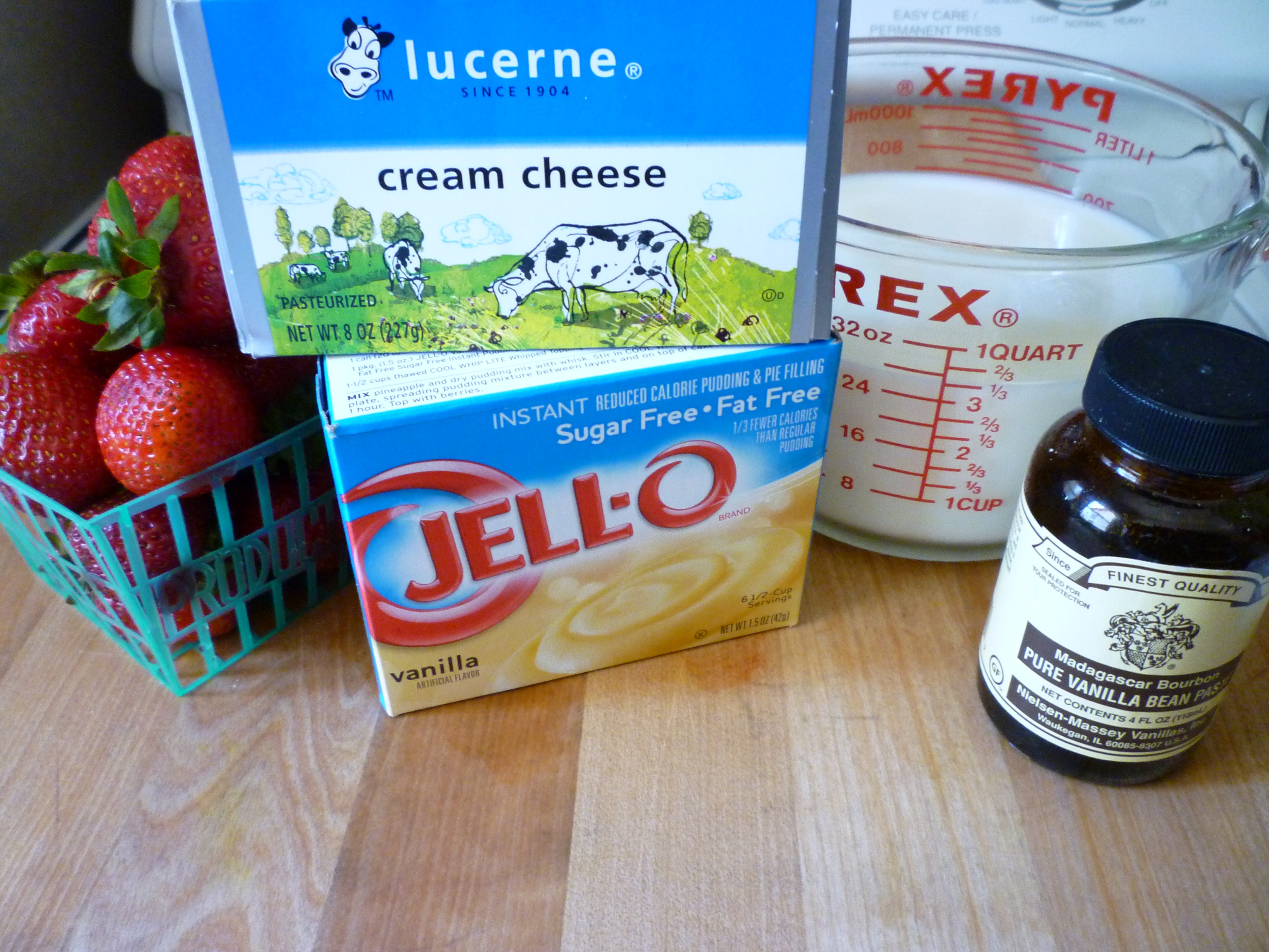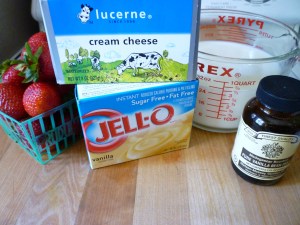 This is what I used … strawberries, sugar-free (or regular) instant pudding mix, milk, cream cheese and vanilla bean paste …