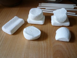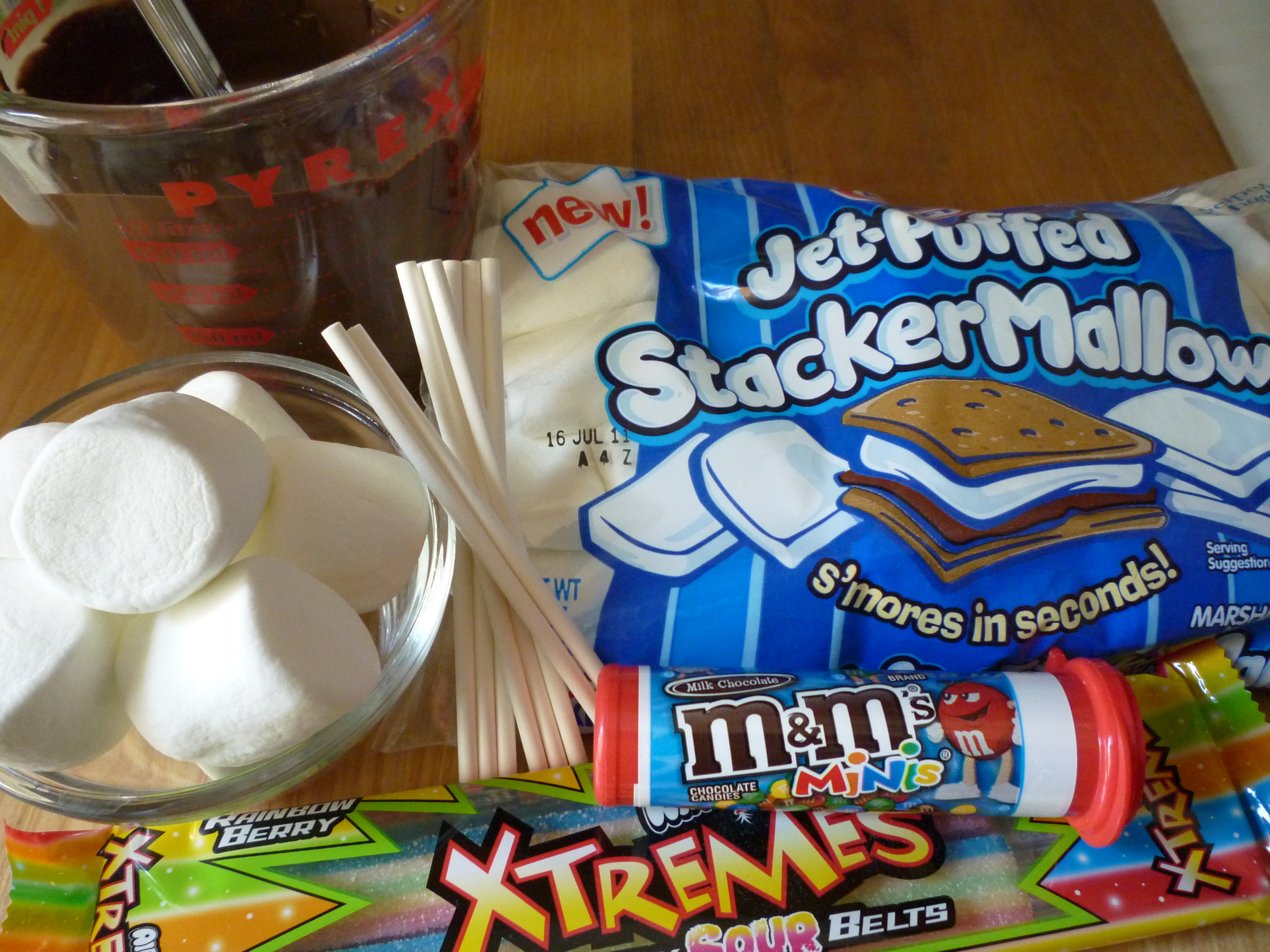 You will need … Jumbo marshmallows, Stackermallows (new from Kraft at Wal-Mart), AirHeads Xtremes, mini M&Ms, yellow candy melts, dark chocolate candy melts and lollipop sticks (I used 6″) …