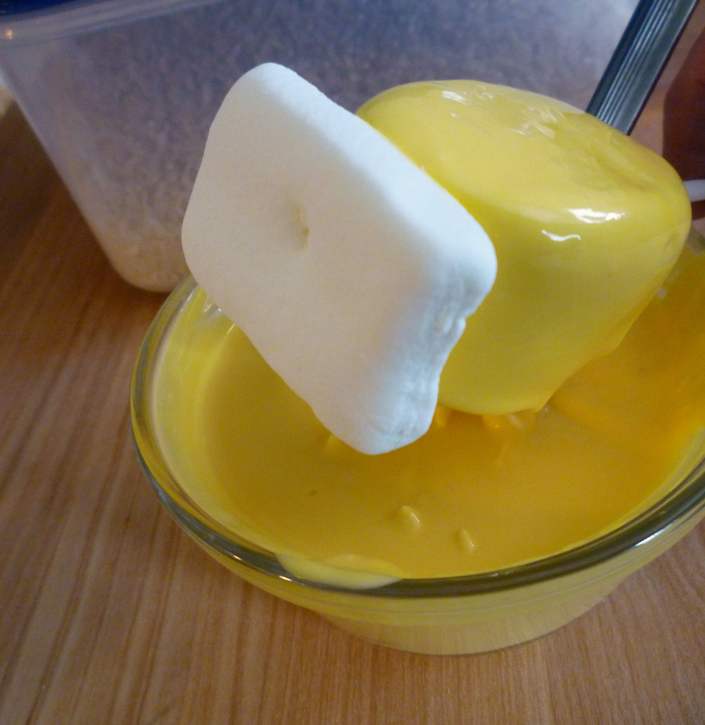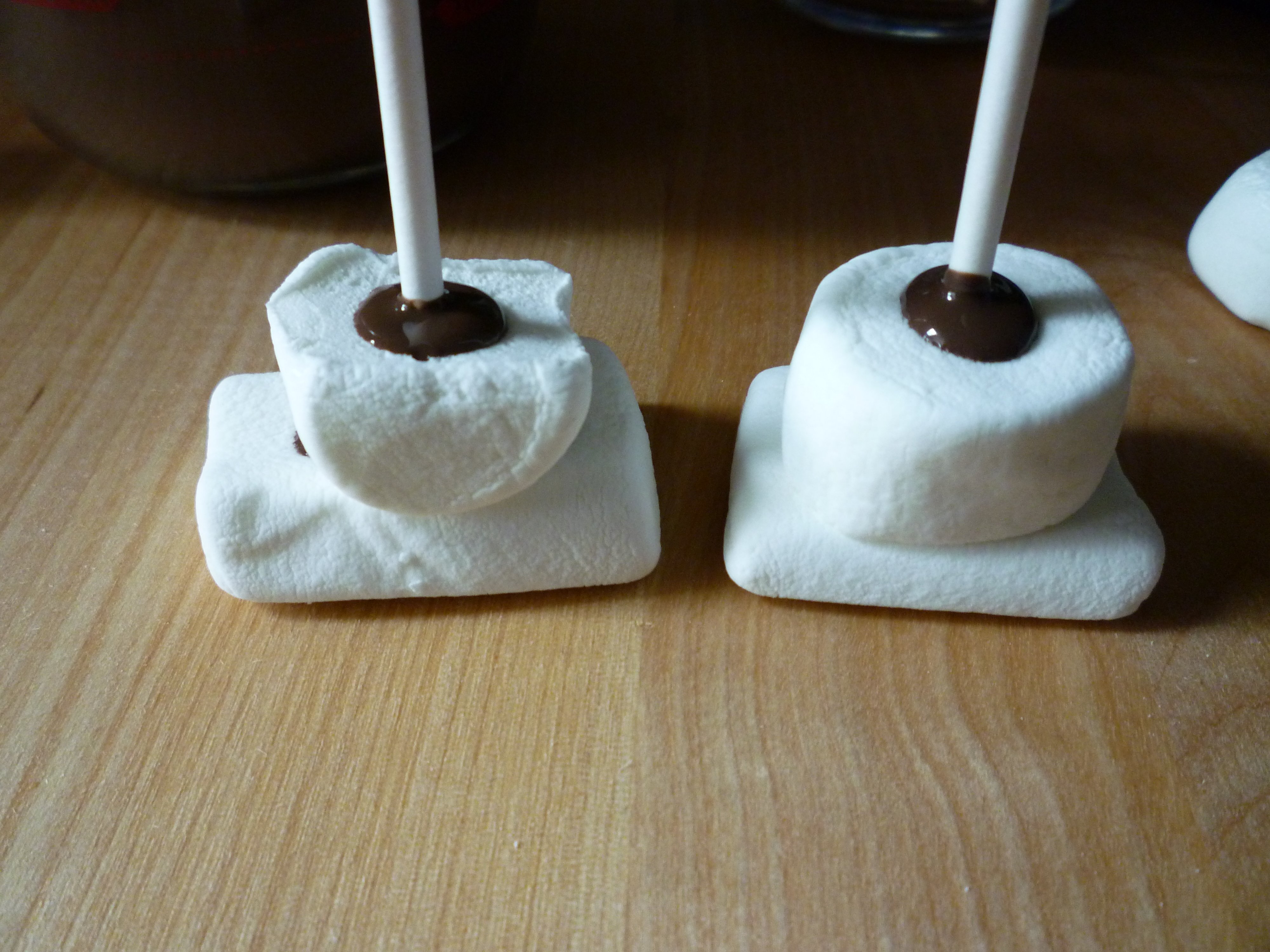Dip it in melted yellow chocolate … tap off excess chocolate … place StackerMallow on top, making sure that the stick is in the rectangular marshmallow … the melted chocolate will help “glue” the rectangular marshmallow …