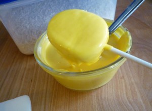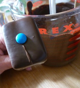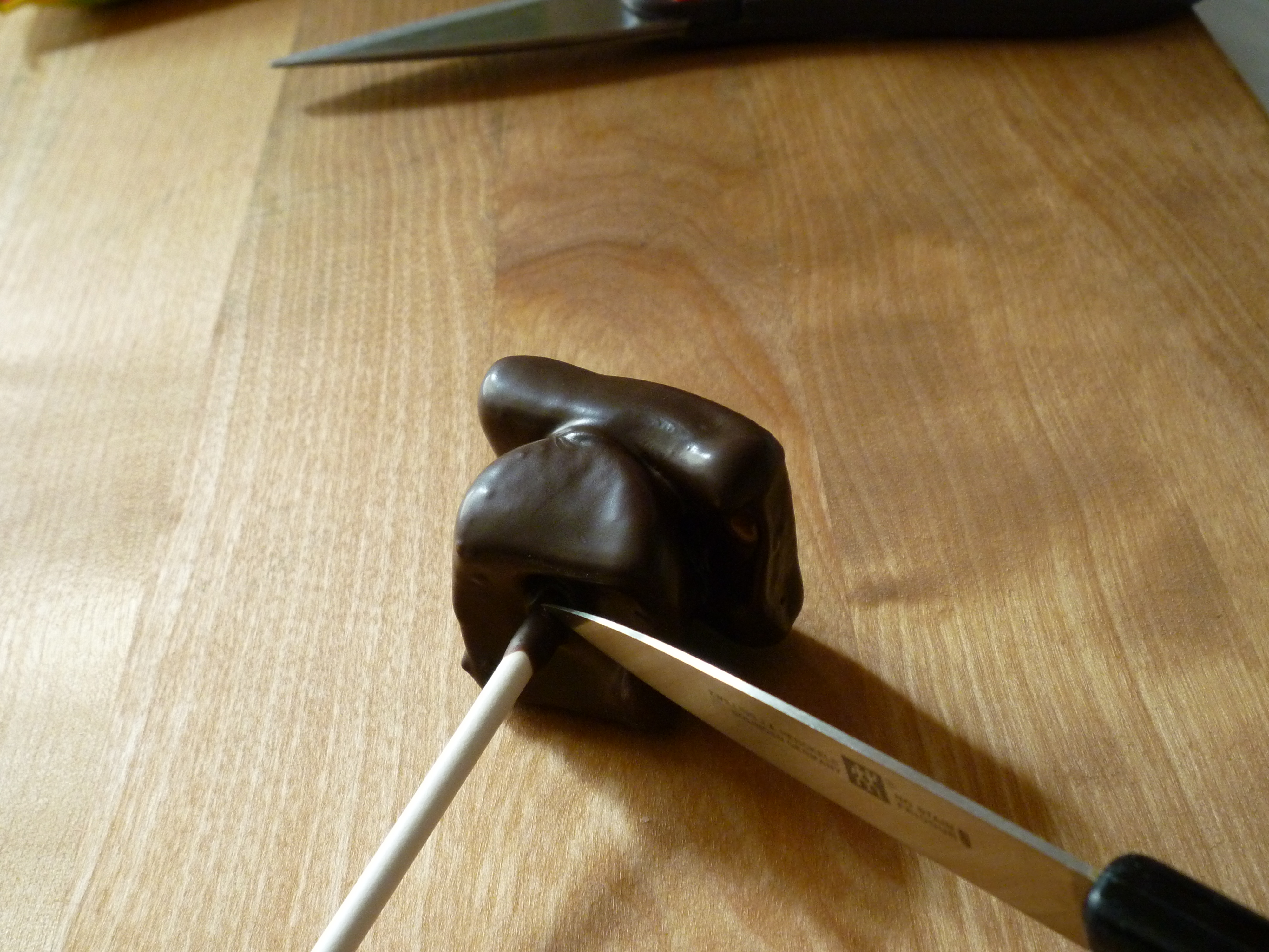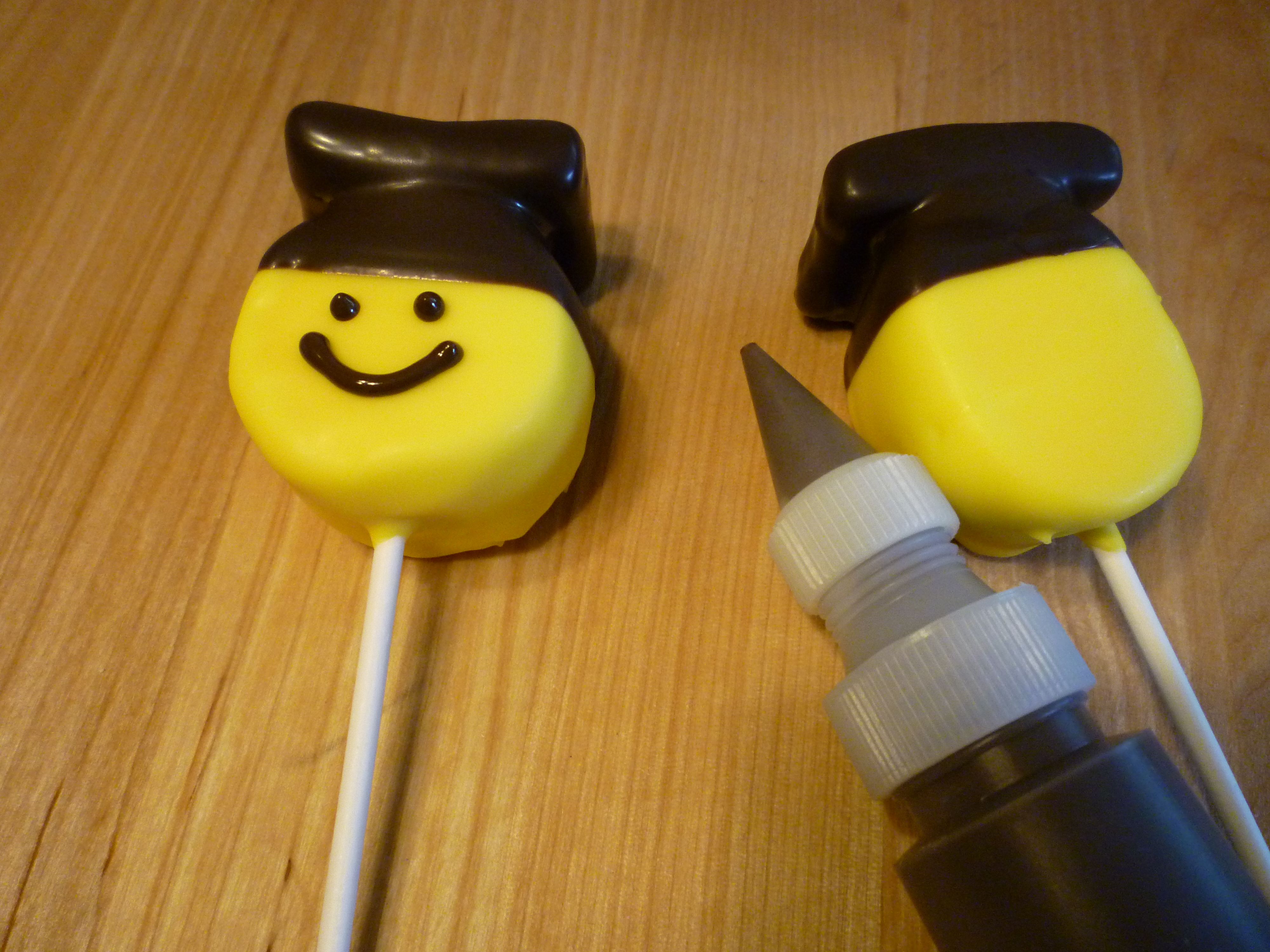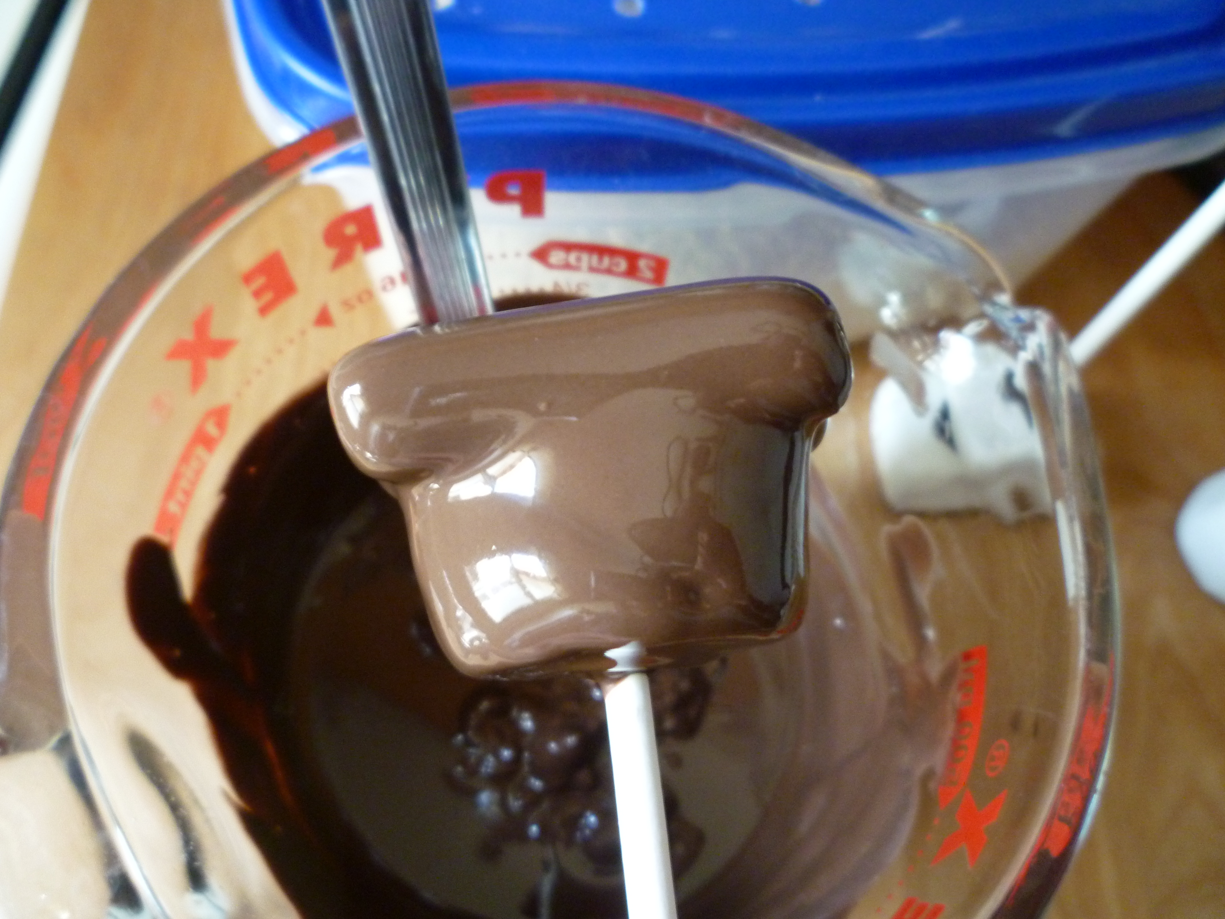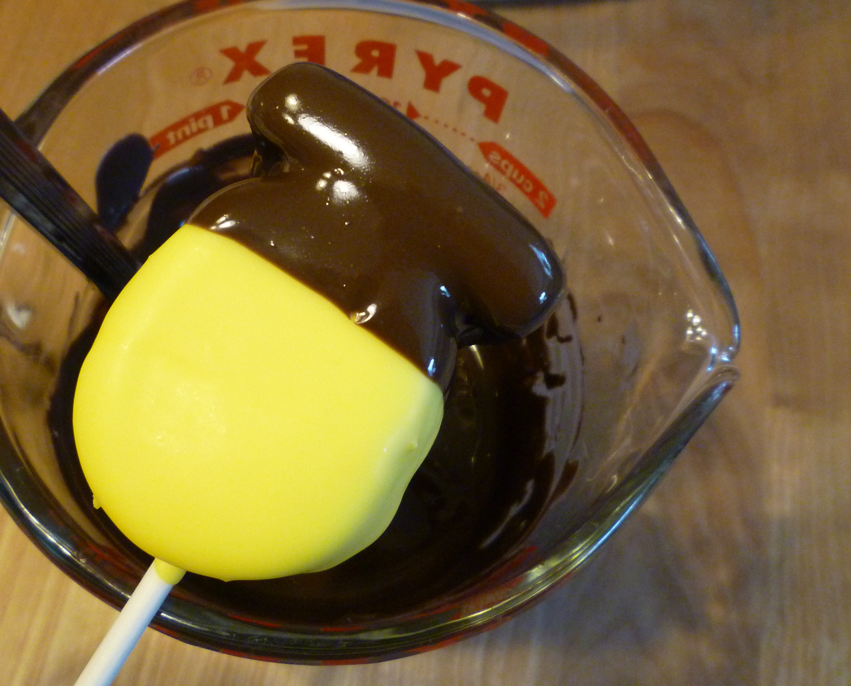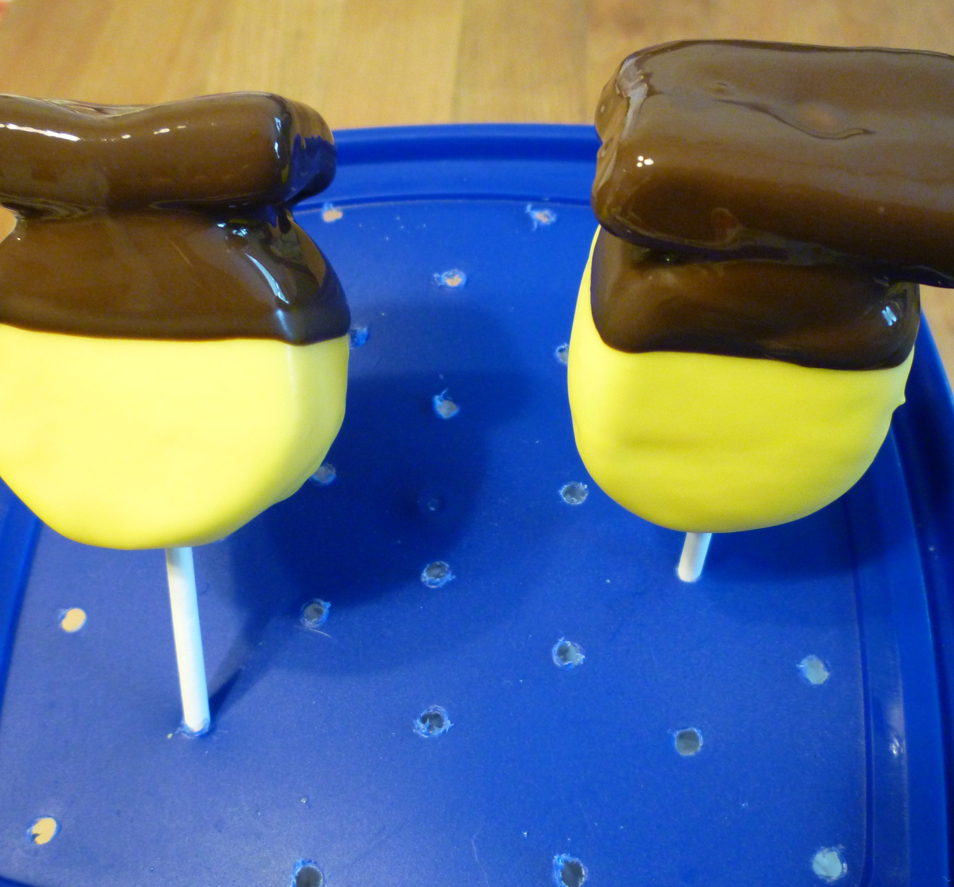 Pop them in the refrigerator or freezer for a few minutes … melt the dark chocolate … while the lollipop is still cool … dip the rectangular marshmallow and a small portion of the oval (yellow) in the dark chocolate, forming the “cap” …