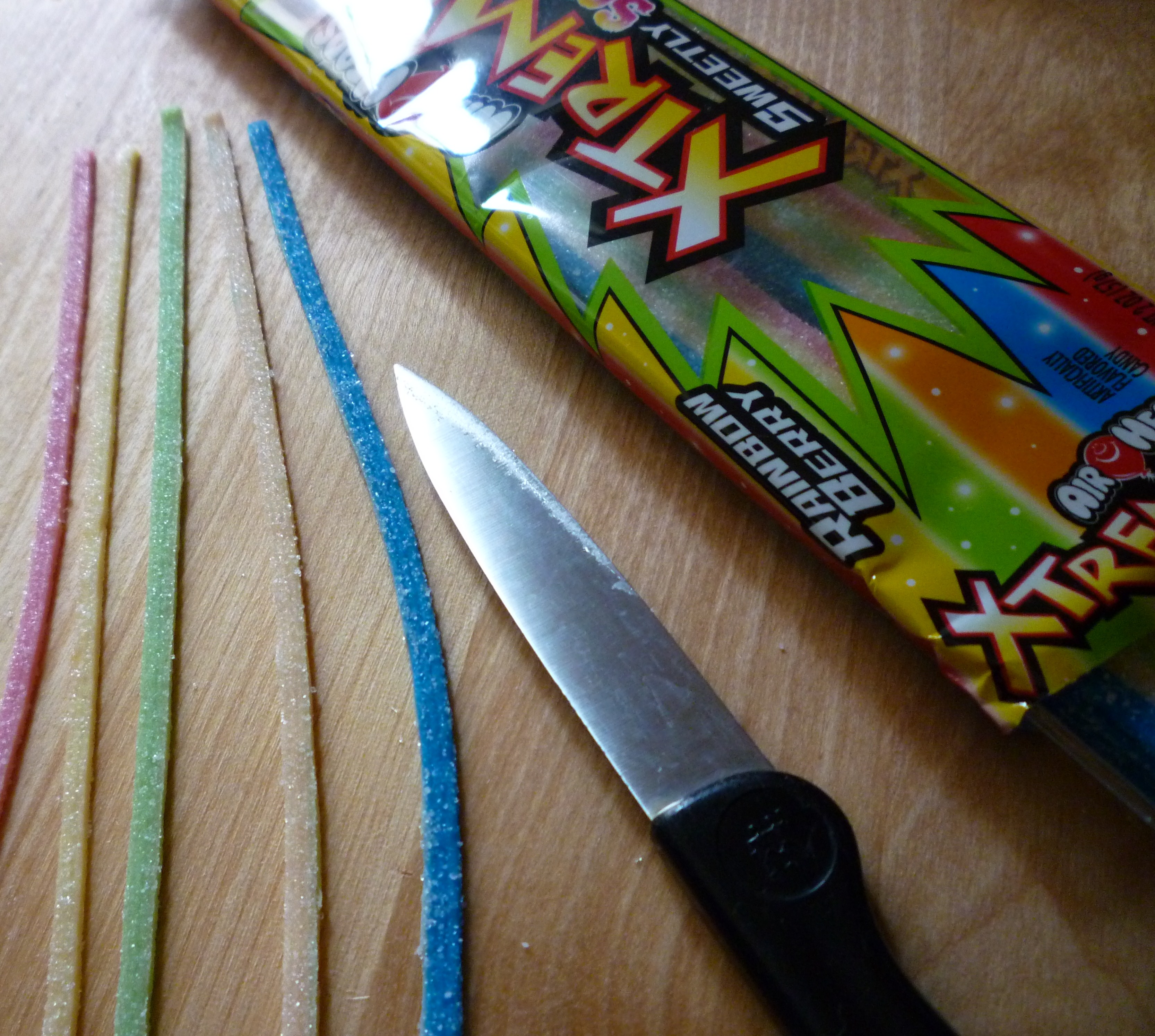 To make the tassel … using melted chocolate, attach an M&M (M down) … use a paring knife to slice the AirHeads in strips about 1-1/2″ long … attach with melted chocolate …
