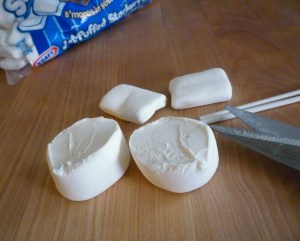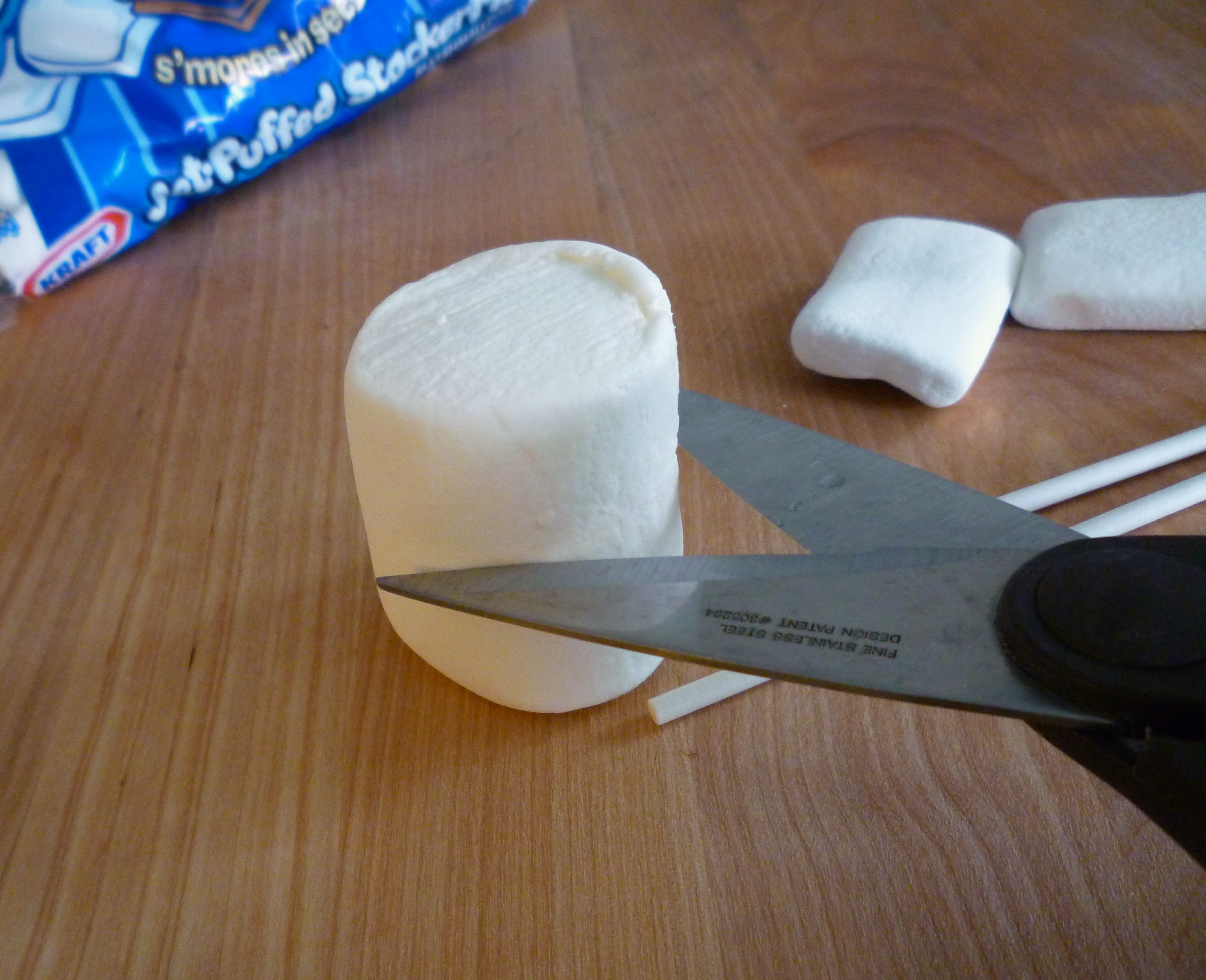 Melt the yellow chocolate (see how to melt chocolate). Cut the Jumbo Marshmallows in half (I used kitchen shears) so that you have 2 ovals/rounds …
