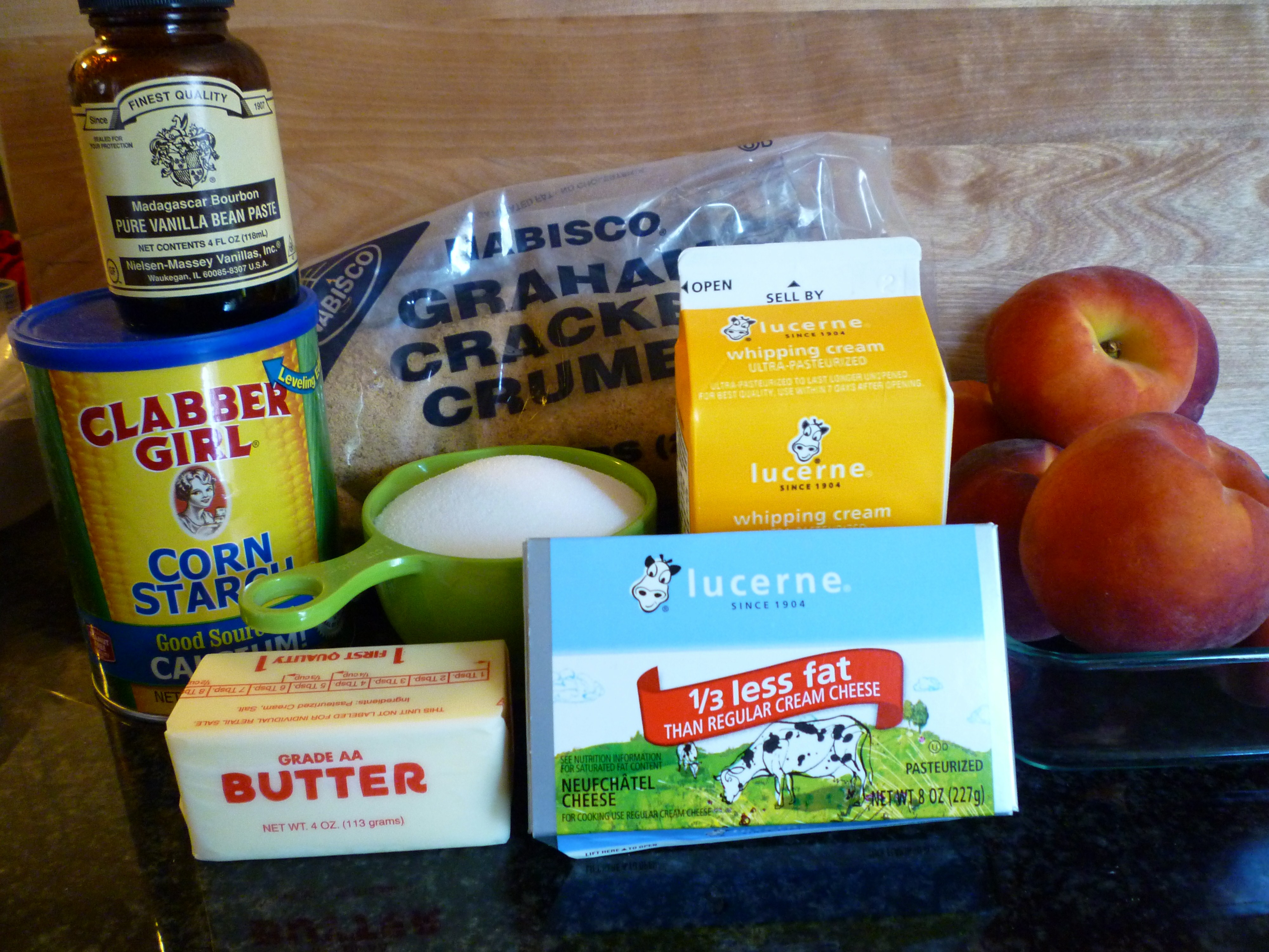 This is what you will need for the crust – graham cracker crumbs, sugar and butter. For the pie – peaches, sugar, cornstarch, cream cheese, vanilla bean paste and whipping cream