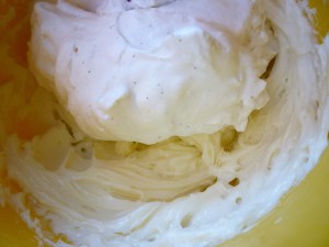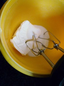Whip the softened cream cheese and sugar until well blended … then fold in 1 cup of the whipped cream … put the remaining whipped cream back in the fridge and save for garnish …