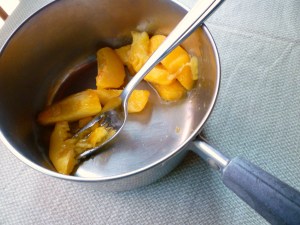 In a saucepan, mash-up the peaches for the glaze … add water … boil for 2 minutes …
