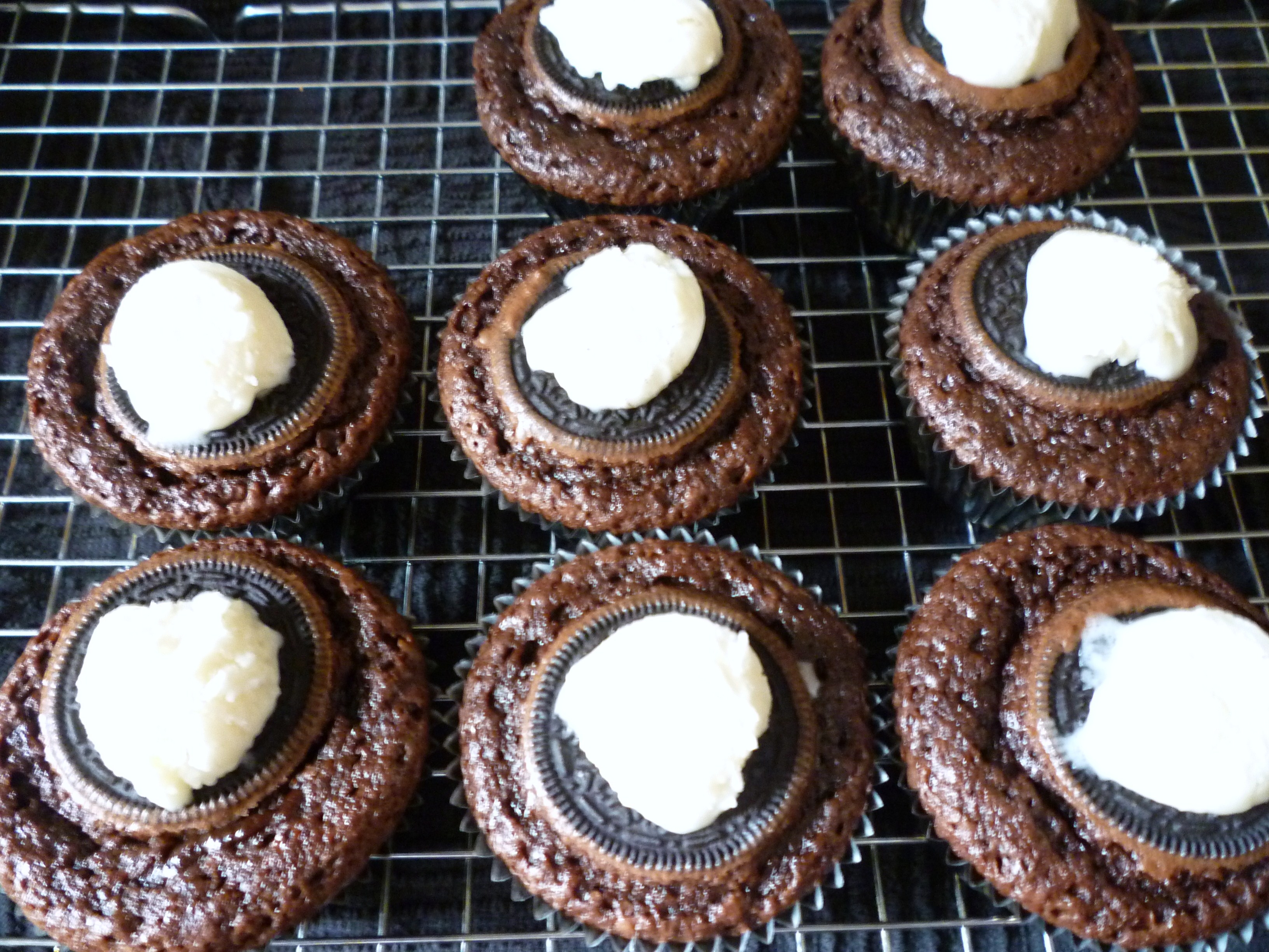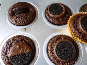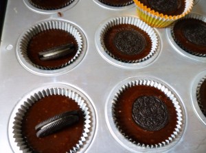 Then put the Oreos in the cupcake batter … and put them in the oven @ 350° for 25 minutes …