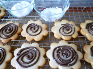 Bake at 350° for 10-12 minutes. Cool, drizzle chocolate on top and sprinkle with sea salt.